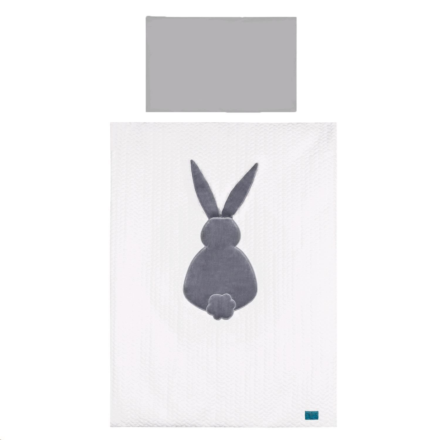 Otroški 3-delni komplet za posteljico Belisima Zajček. Komplet je z ene strani izdelan iz jersey blaga, okrašenega s 3D vzorcem in ljubkim plišastim zajčkom. Druga stran je bombažna. Izdelan je iz mehkega, prijetnega materiala. Vključuje prevleko za blazino približno 40x60 cm, prevleko za odejo približno 100x135 cm in obrobo približno 31x175 cm. Sestava: zgornja jersey stran: 50% bombaž, 50% poliester. Spodnja stran: 100% bombaž.