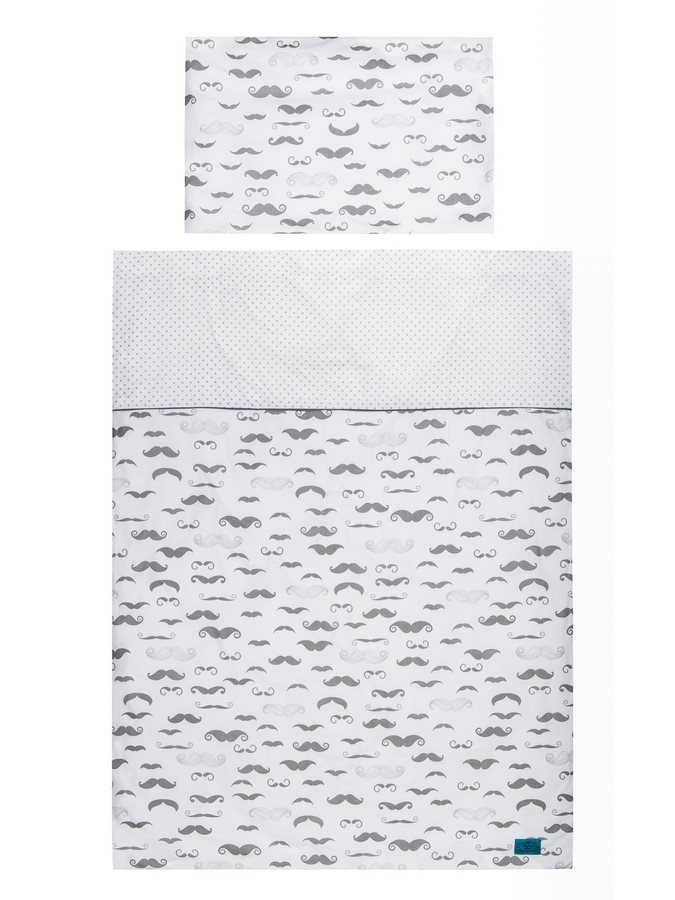 Otroška bombažna 6-delna posteljna komplet Belisima Little Man za dojenčke. Komplet krasijo izvirni vzorci brkov in prijetne barve. Izdelan je iz mehkega, prijetnega materiala. Komplet vključuje prevleko za blazino cca 40x60 cm, prevleko za odejo cca 100x135 cm, zaščitni obroč cca 180 cm, polnilo za blazino in odejo ter zaveso. Material 100% bombaž.