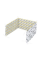 Detski bombažni 6-delni komplet za posteljico Belisima Mucki za dojenčke. Komplet je z ene strani celotno potiskan s pikicami, druga stran pa je celotno potiskana z motivi muckov. Izdelan je iz mehkega in prijetnega materiala. Komplet vključuje prevleko za blazino cca 40x60 cm, prevleko za odejo cca 100x135 cm, zaščitno obrobo cca 180 cm ter polnilo: blazino, odejo in zaveso. Zavesa: 150x200 cm. Material 100% bombaž.