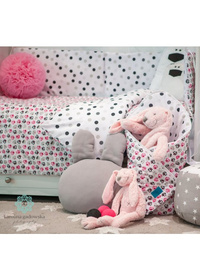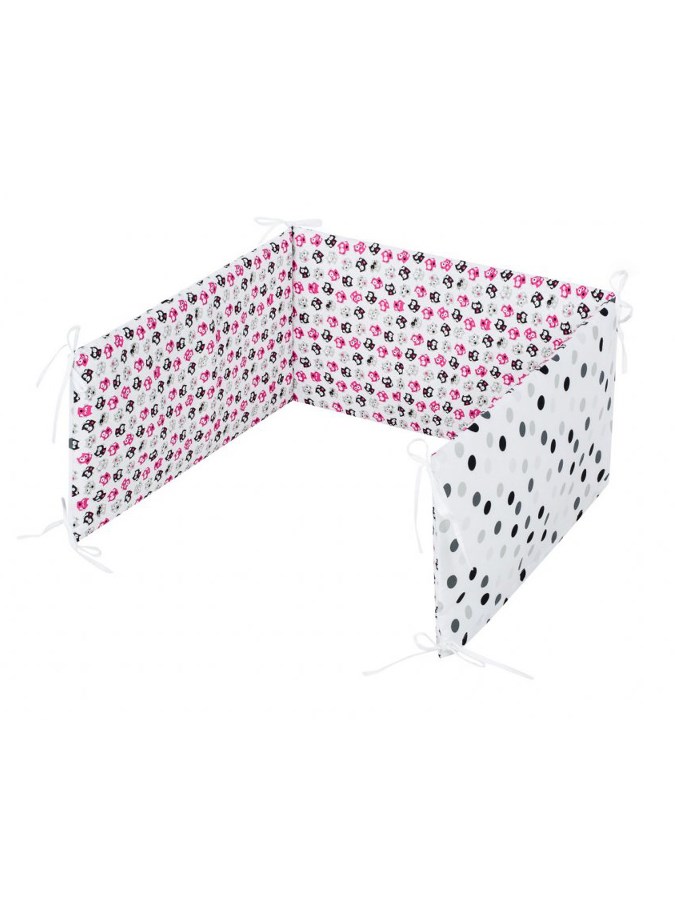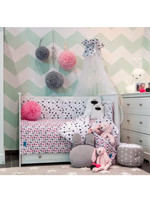 Detski bombažni 6-delni komplet za posteljico Belisima Mucki za dojenčke. Komplet je z ene strani celotno potiskan s pikicami, druga stran pa je celotno potiskana z motivi muckov. Izdelan je iz mehkega in prijetnega materiala. Komplet vključuje prevleko za blazino cca 40x60 cm, prevleko za odejo cca 100x135 cm, zaščitno obrobo cca 180 cm ter polnilo: blazino, odejo in zaveso. Zavesa: 150x200 cm. Material 100% bombaž.