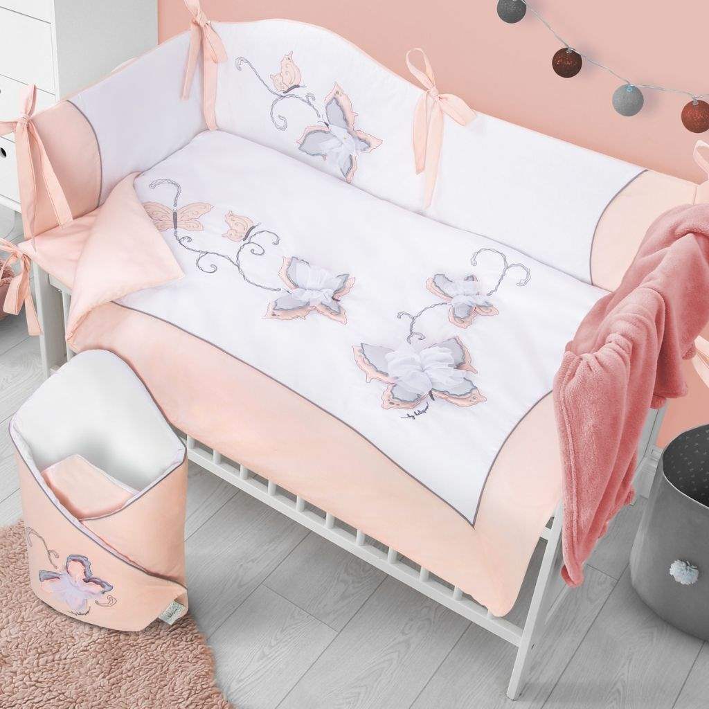 Lepa otroška bombažna 6-delna posteljna garnitura Belisima Butterfly za dojenčke. Narejena je iz mehkih, prijetnih materialov. Garnitura vsebuje prevleko za blazino približno 40x60 cm, prevleko za odejo približno 100x135 cm, ograjo približno 180 cm, polnilo za blazino in odejo ter zaveso. Material 100% bombaž.