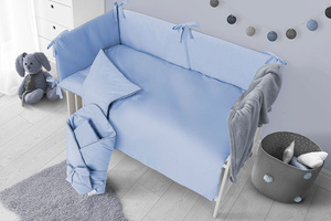 Čudovit otroški bombažni 6-delni komplet za posteljico Belisima Palermo za dojenčke. Narejen je iz mehkega, prijetnega materiala. Komplet vključuje prevleko za blazino cca 40x60 cm, prevleko za odejo cca 90x120 cm, zaščitno obrobo cca 180 cm, polnilo za blazino in odejo, ter zaveso. Material 100% bombaž.
