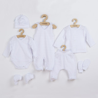 Ljubka 7-delna komplet za dojenčke češke blagovne znamke New Baby I AM. Komplet je izdelan iz zelo prijetnega, mehkega in kakovostnega materiala, ki je primeren za dojenčke in ni primeren le za porodnišnico. Vsebuje celovito zapiranje bodija z dolgimi rokavi, pajkice, polpajkice, jopico, kapico, rokavičke in copatke. Bodij ima stransko zapiranje po celotni dolžini in gumbke med nogami. Pajkice imajo zapiranje na gumbke na naramnicah in med nogami, kar olajša oblačenje in previjanje. Jopica se zapira z gumbki po celotni dolžini. Kapica z širšim robom dobro drži na glavi dojenčka in ne pada dol. Je zelo praktična in ne pritiska na glavo dojenčka. Rokavičke in copatki imajo širšo zategovalno manšeto. Celoten komplet ima nov izjemen dizajn z atraktivnim vzorcem tkanine. Je zasnovan ob upoštevanju potreb dojenčka in je primeren tudi kot ljubko darilo. Komplet je pakiran v praktični ekološki škatli. Sestava: 100% bombaž.