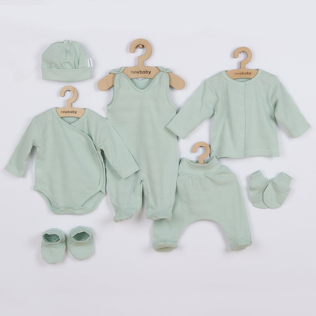 Ljubka 7-delna komplet za dojenčke češke blagovne znamke New Baby I AM. Komplet je izdelan iz zelo prijetnega, mehkega in kakovostnega materiala, ki je primeren za dojenčke in ni primeren le za porodnišnico. Vsebuje celovito zapiranje bodija z dolgimi rokavi, pajkice, polpajkice, jopico, kapico, rokavičke in copatke. Bodij ima stransko zapiranje po celotni dolžini in gumbke med nogami. Pajkice imajo zapiranje na gumbke na naramnicah in med nogami, kar olajša oblačenje in previjanje. Jopica se zapira z gumbki po celotni dolžini. Kapica z širšim robom dobro drži na glavi dojenčka in ne pada dol. Je zelo praktična in ne pritiska na glavo dojenčka. Rokavičke in copatki imajo širšo zategovalno manšeto. Celoten komplet ima nov izjemen dizajn z atraktivnim vzorcem tkanine. Je zasnovan ob upoštevanju potreb dojenčka in je primeren tudi kot ljubko darilo. Komplet je pakiran v praktični ekološki škatli. Sestava: 100% bombaž.