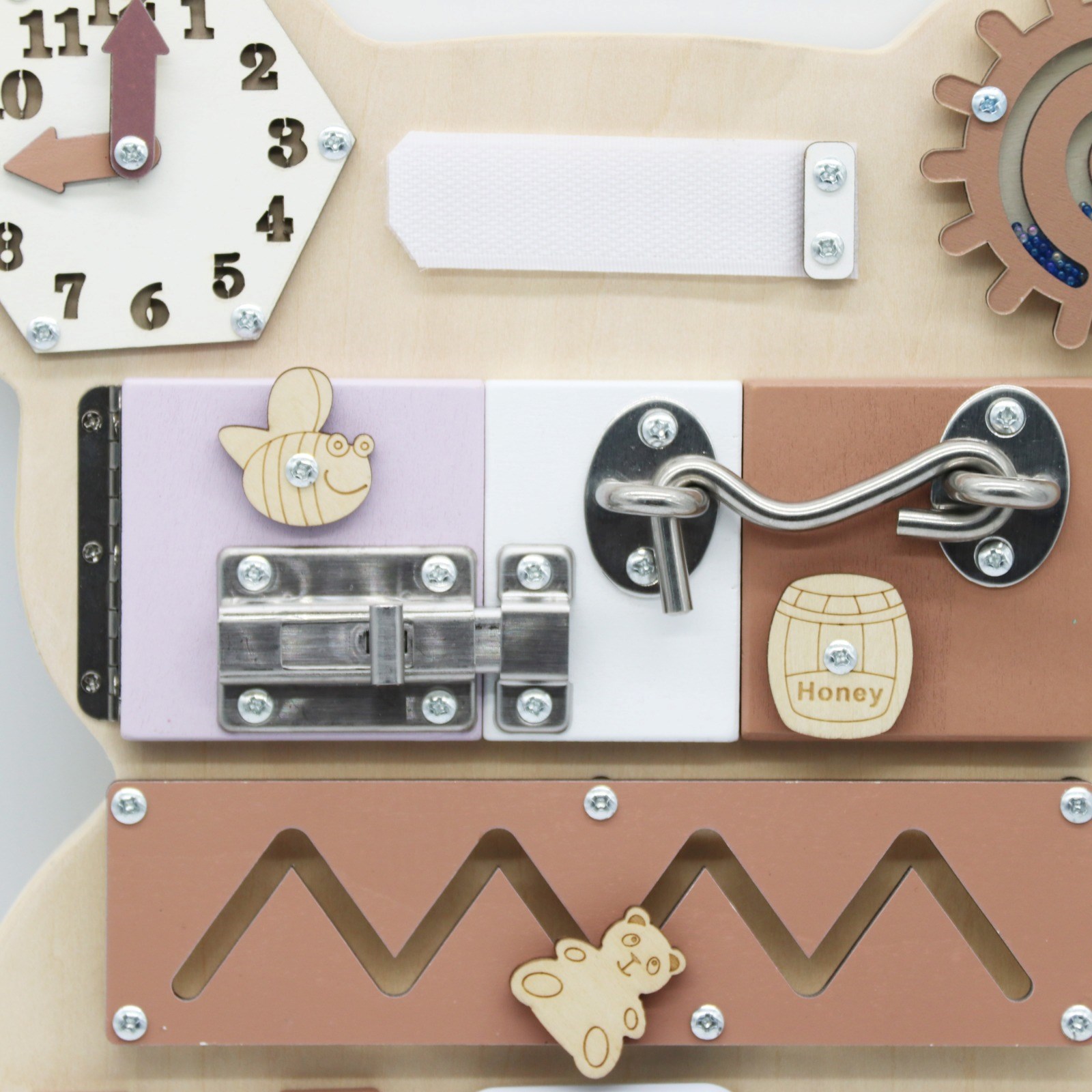 Dřevěná manipulační tabule Busy Board ve tvaru medvídka zabaví děti na dlouhé hodiny a zároveň podporuje jejich přirozený vývoj. Díky kombinaci různých prvků si dítě procvičuje jemnou motoriku, trpělivost i logické myšlení – a to zábavnou a bezpečnou formou.