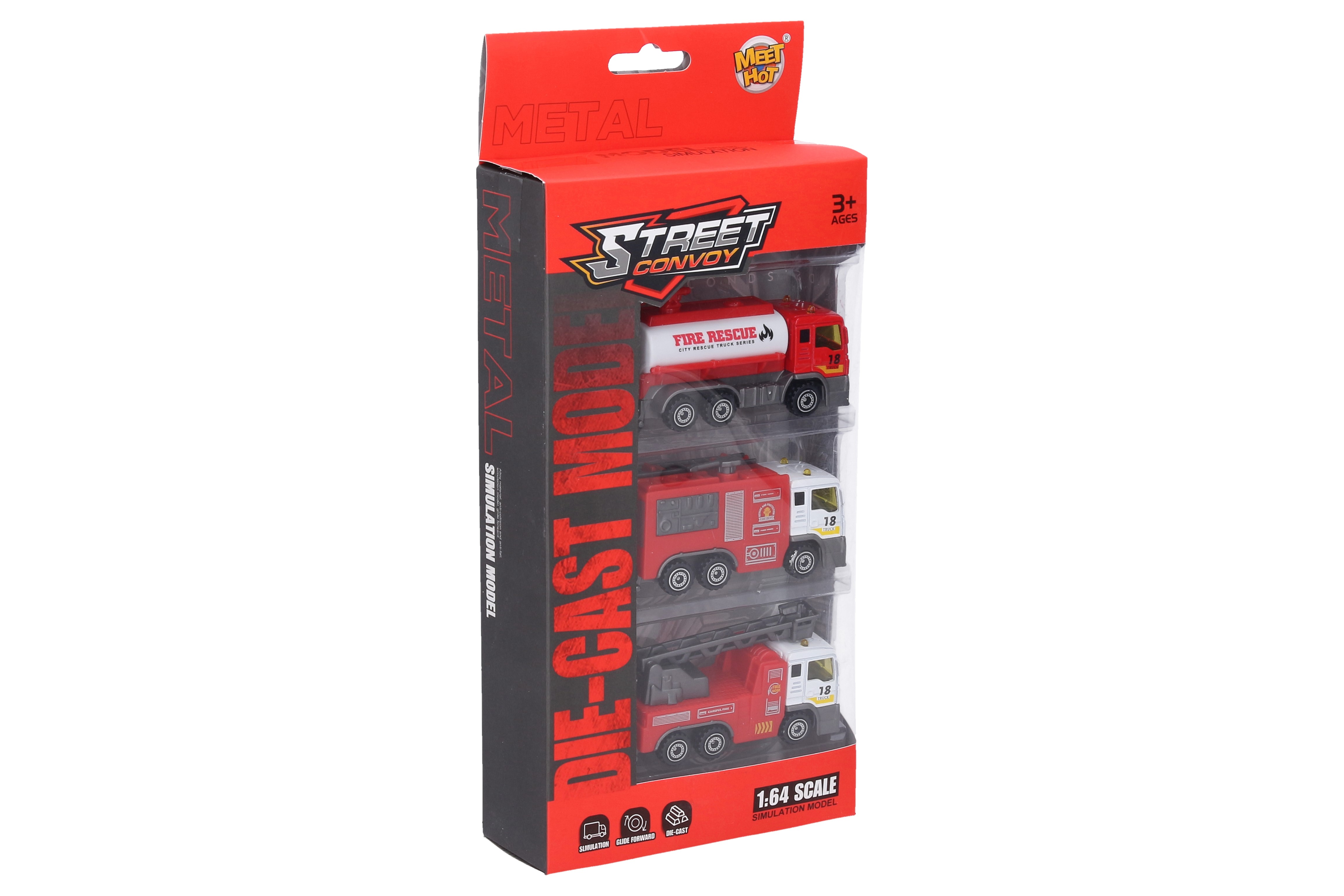 Auta hasičská kov plast 3 ks. Velikost 8,5 cm. Kovová kabina. Volná kola.