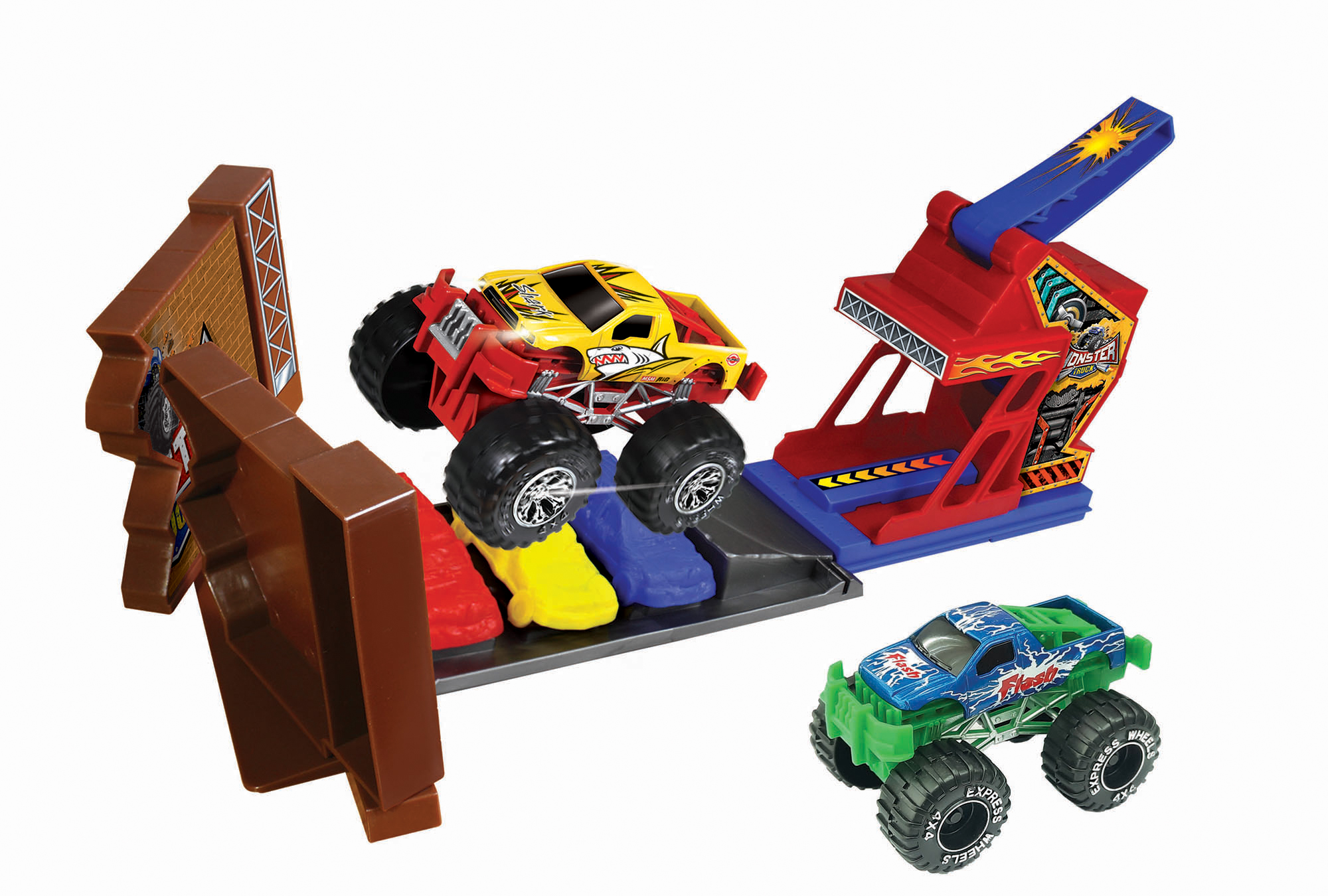 Auta Monster truck Kaskadérská dráha s 2 kovovými auty. Volná kola. Úkolem je přeskočit auta a zbourat zeď.