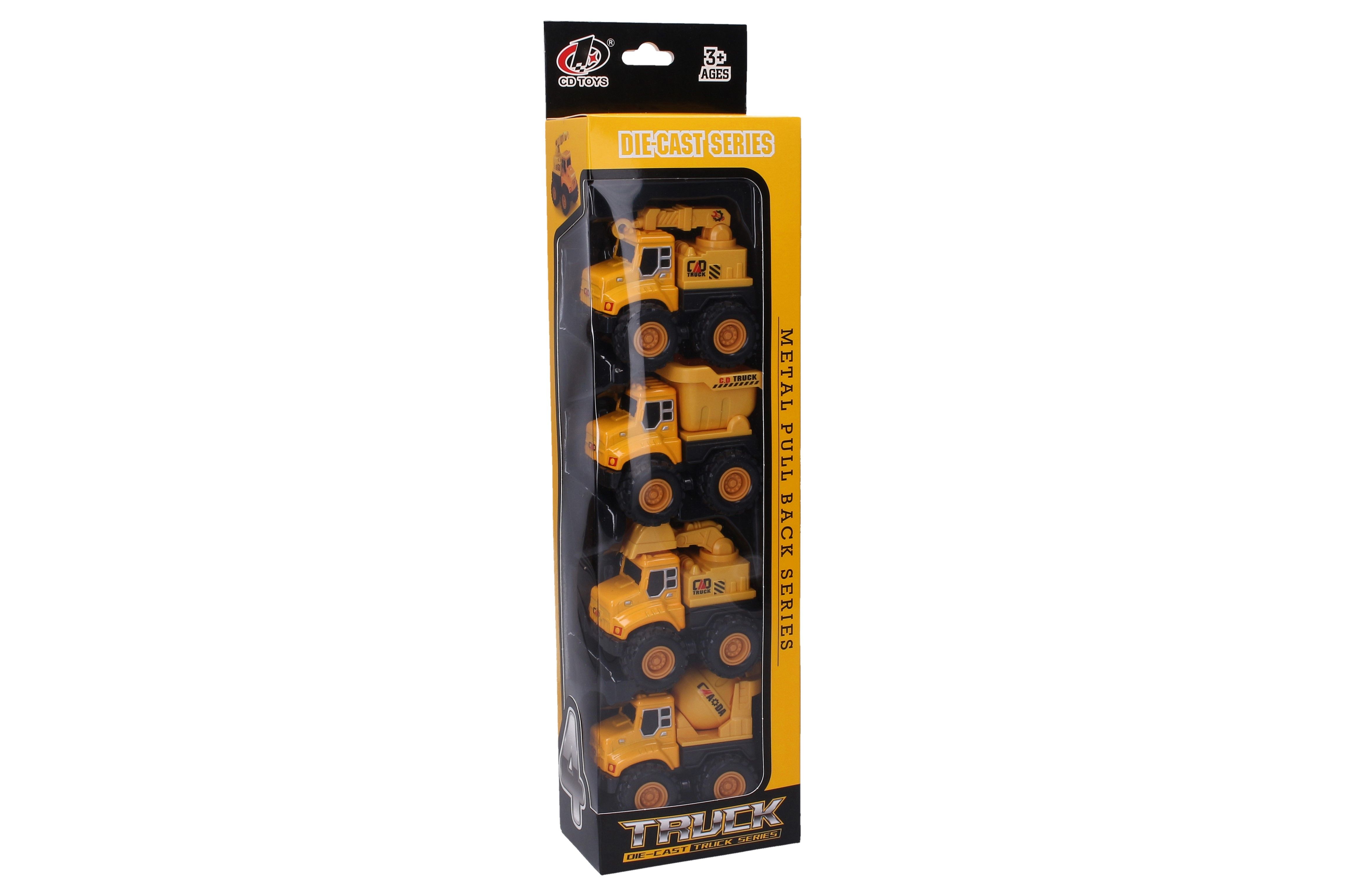 uta stavební set kov/plast 4ks. Velikost autíčka 7,5x6x6,9 cm. Obsahuje: autojeřáb, sklápěč, bagr, domíchávač. Na zpětné natažení, vyklápěcí korba, otočný jeřáb.
