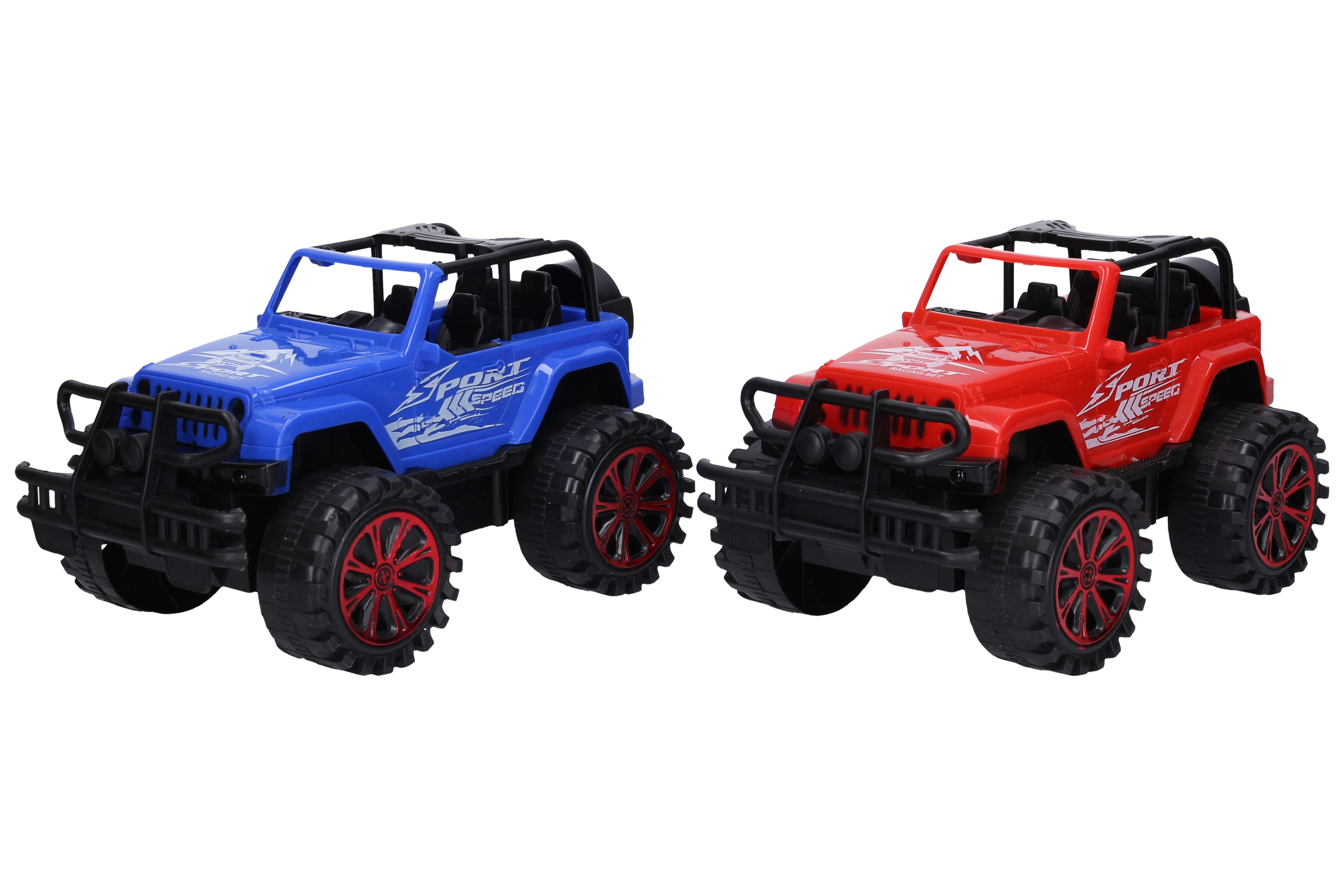 Auto terénní. Rozměry 22x14x11 cm. Na setrvačník. 2 varianty - červená, modrá.