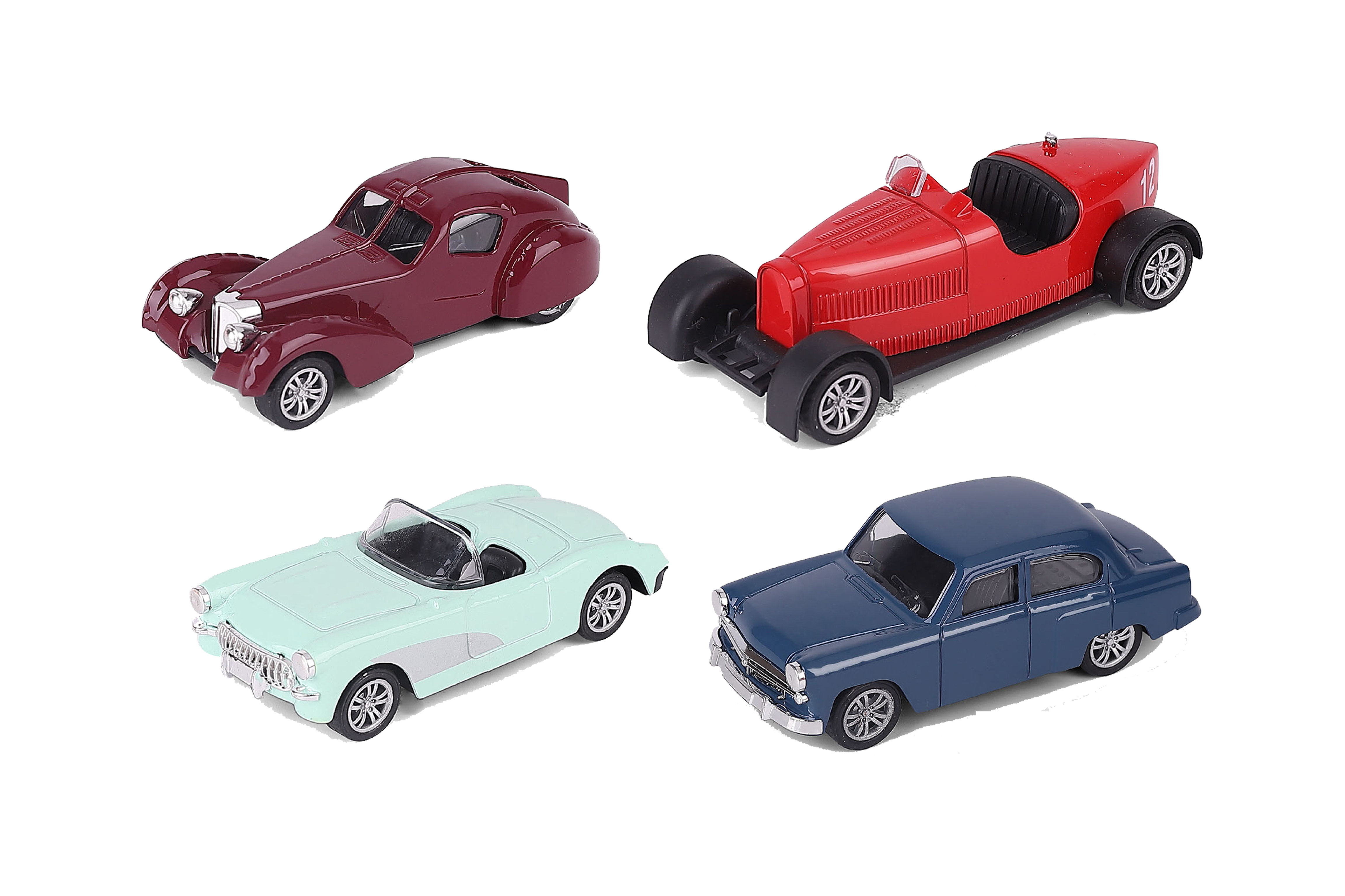Auto veterán na zpětné natažení, kovové. Rozměry 10,5x4,5x2,8 cm. Display box 24 ks. 4 varianty - červená, zelená, modrá, hnědá. Měřítko 1:43.