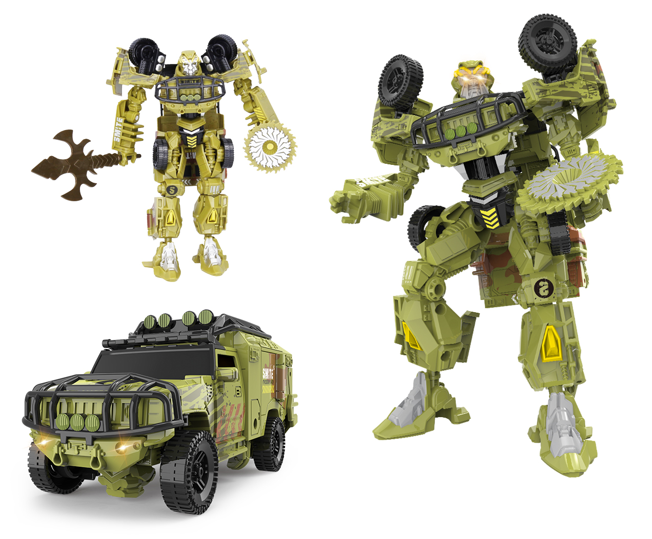 Autorobot. Velikost 17 cm. Transformace na obrněné vozidlo. Balení obsahuje 2 zbraně - meč a pila. Volná kola. 2 varianty - modrá, zelená.