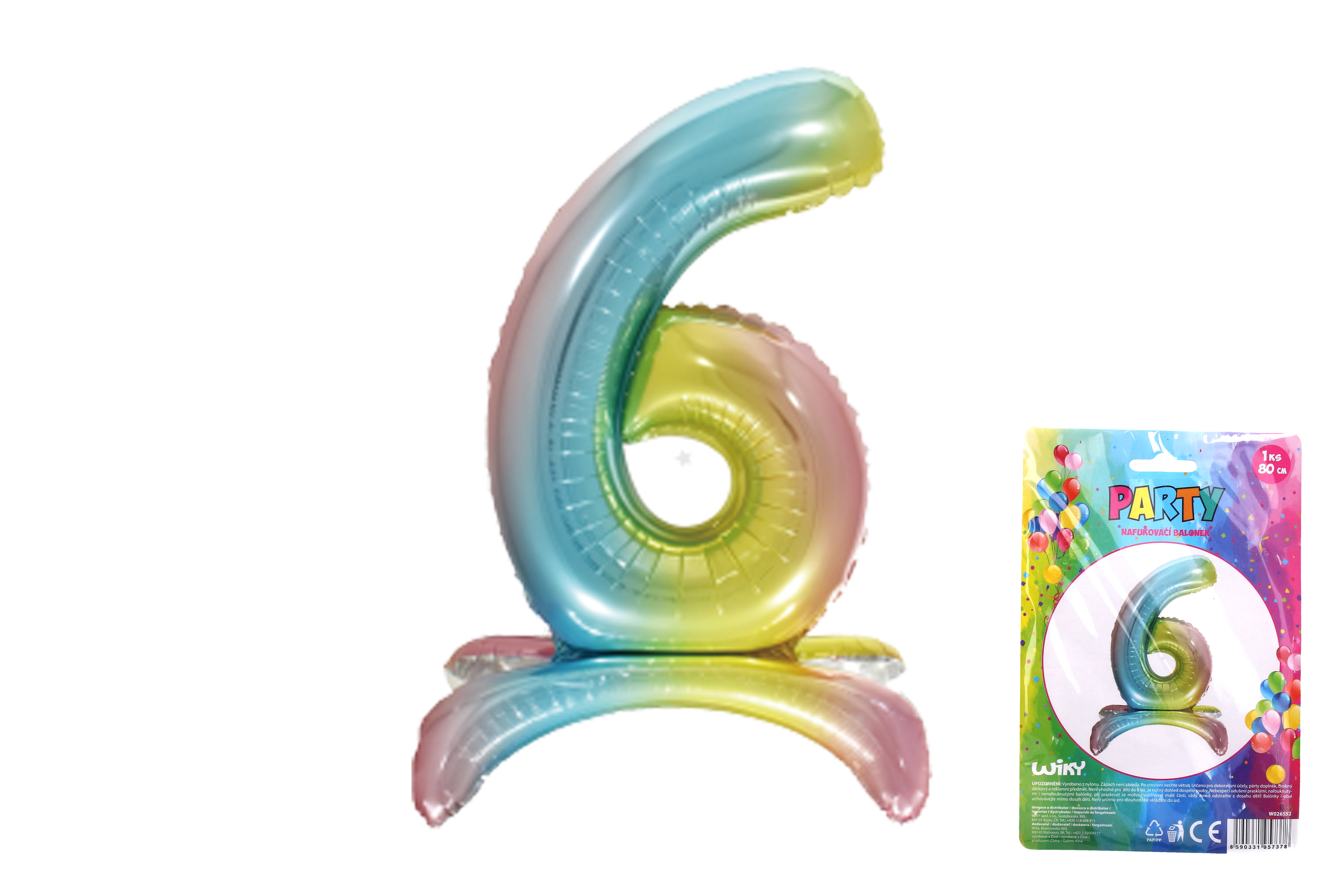 Balónek nafukovací ve tvaru čísla 6 Duha. Velikost balónku v nenafouklém tvaru 80 cm.