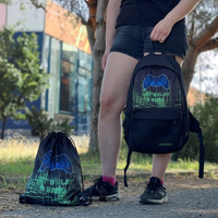 Promyšlená vnitřní organizace: hlavní otevíratelná komora na zip s dvěma jezdci; uvnitř je tuhá kapsa vhodná pro laptop nebo výkresy. Menší přední kapsa se skrytým zipem je ideální na svačinu nebo drobnosti – nad ní moderní herní grafika v výrazných barvách, která batohu dodává osobitý styl.