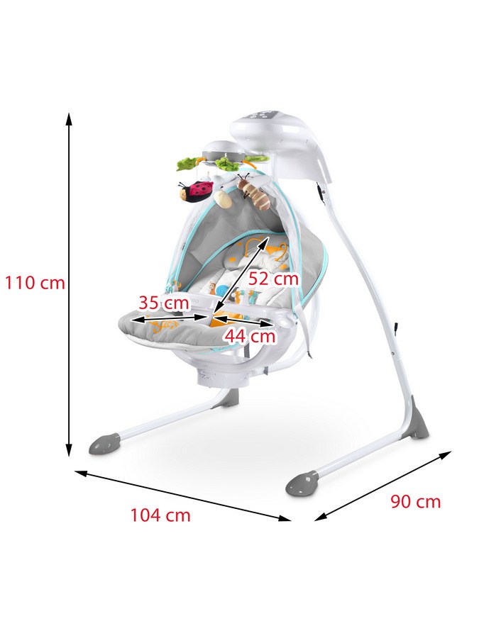 NEMÁ ORIGINÁL OBAL, VYSTAVENÉ ZBOŽÍ Krásná a praktická houpačka CARETERO Bugies. Houpačku lze snadno složit a nezabere tak moc místa. Součástí je kolotoč s hračkami a melodii, stříška s moskytiérou, díky které můžete houpačku používat i na zahradě či terase. Houpačku lze nastavit do 2 poloh a sedadlo se otáčí o 90°, to vše zajistí pohodlí Vašemu miminku během hraní i odpočinku. Kvalitní materiál, kovová konstrukce a bezpečnostní pásy, to je záruka bezpečí pro Vaše dítě. Houpačka je vhodná pro děti do 12 kg.