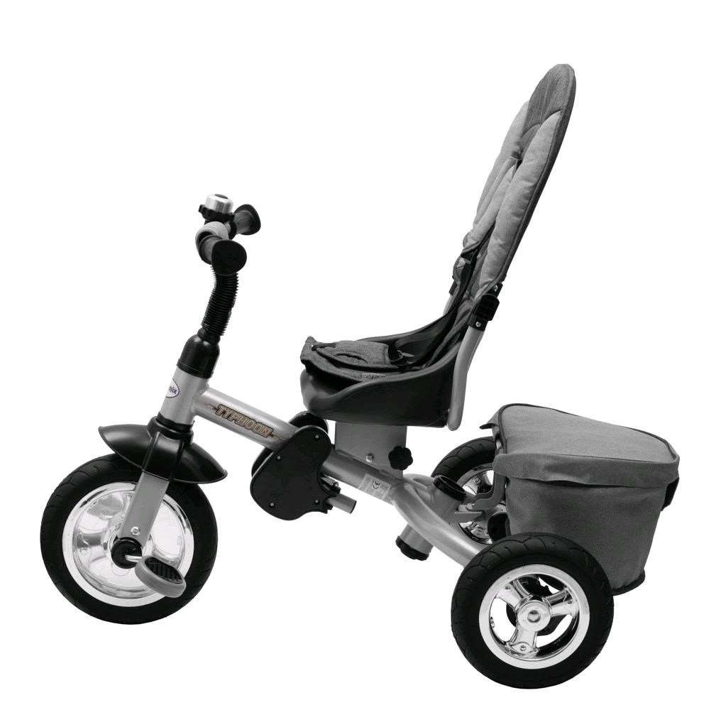 Dětská šlapací tříkolka Baby Mix TYPHOON je multifunkční dopravní prostředek a je typickým příkladem produktů GROW UP - roste zároveň s dítětem. Tříkolku může ovládat jak dítě, tak i rodič pomocí nastavitelné vodící tyče. Po odebrání vodící tyče, sklápěcí stříšky a opěrek bude sloužit jako klasická šlapací tříkolka. Pevná ocelová konstrukce zajistí dítěti bezpečnost a zaručí její používání po mnoho let. Pohodlné a ergonomicky tvarované sedadlo je otočné o 360 stupňů, což umožní dítěti cestovat ve směru nebo proti směru jízdy. O pohodlí a bezpečí během jízdy se stará odnímatelná hrazda, tříbodové bezpečnostní pásy, pohodlné odnímatelné stupačky nebo gumová kola, která skvěle absorbují nerovnosti, poskytují perfektní přilnavost a nevyžadují huštění. Pro uložení hraček nebo potřeb pro dítě je zde praktický úložný košík.