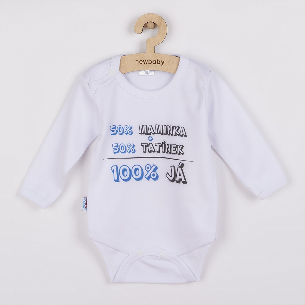 Originální bavlněné kojenecké body s dlouhým rukávem New Baby, s vtipným nápisem 50% MAMINKA + 50% TATÍNEK - 100% JÁ. Body má kolem krčku, nožiček a ručiček barevné lemování. Barvy použité k potisku jsou certifikované a vhodné pro miminka. Je vyrobeno z příjemného a kvalitního materiálu, ve kterém se bude Vaše miminko cítit příjemně. Body má zapínáni na cvočky na ramínku a mezi nožičkami, což usnadňuje oblékání a přebalování. Dopřejte Vašemu miminku vyniknout v originálním body. Složení: 100% bavlna. Rozměry: obvod kolem hrudníku cca 38 cm, délka rukávu cca 21 cm, celková délka cca 33 cm.