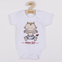 Originální bavlněné kojenecké body s krátkým rukávem New Baby s nápisem MIMI ŠÉF a obrázkem. Barvy použité k potisku jsou certifikované a vhodné pro miminka. Je vyrobeno z příjemného a kvalitního materiálu, ve kterém se bude Vaše miminko cítit příjemně. Body má zapínáni na cvočky na ramínku a mezi nožičkami, což usnadňuje oblékání a přebalování. Dopřejte Vašemu miminku vyniknout v originálním body. Složení: 100% bavlna.