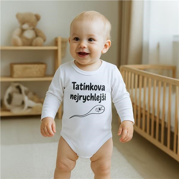 Originální bavlněné kojenecké body s dlouhým rukávem New Baby, s vtipným nápisem TATÍNKOVA NEJRYCHLEJŠÍ. Barvy použité k potisku jsou certifikované a vhodné pro miminka. Je vyrobeno z příjemného a kvalitního materiálu, ve kterém se bude Vaše miminko cítit příjemně. Body má zapínáni na cvočky na ramínku a mezi nožičkami, což usnadňuje oblékání a přebalování. Dopřejte Vašemu miminku vyniknout v originálním body. Složení: 100% bavlna. Rozměry: obvod kolem hrudníku cca 34 cm, délka rukávu cca 16 cm, celková délka cca 30 cm.