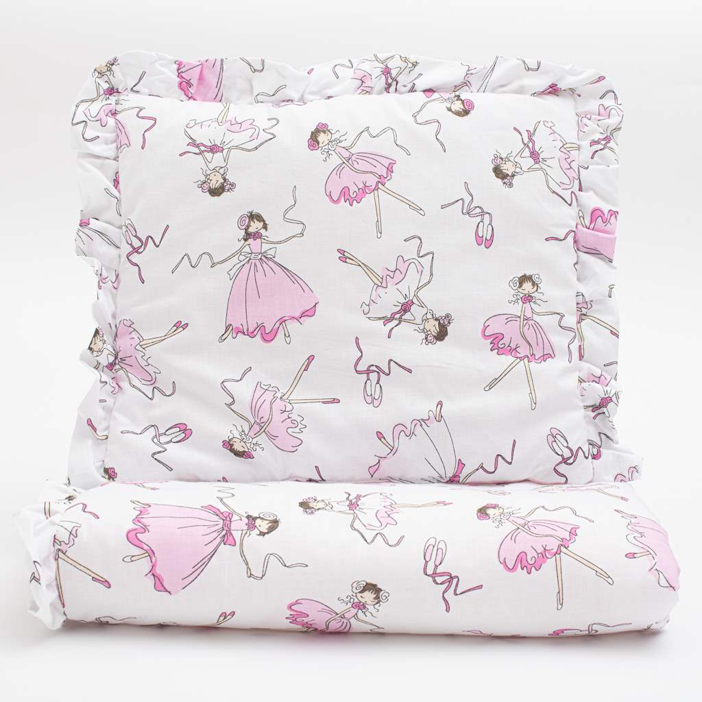 Čudovit bombažni set za voziček New Baby Ballerina Bella. Set vključuje blazino in odejo s volanom ter tiskom pravljice o plesni balerini. Vse je napolnjeno z antialergijskim vlaknom. Set je izdelan iz visokokakovostnega bombaža. Bombažni set razkošno in nežno poboža ter ogreje kožo vašega dojenčka. Dimenzije: blazina: cca 32x25 cm, odeja: cca 82x68 cm. Sestava: prevleka 100% bombaž, polnilo 100% poliester.