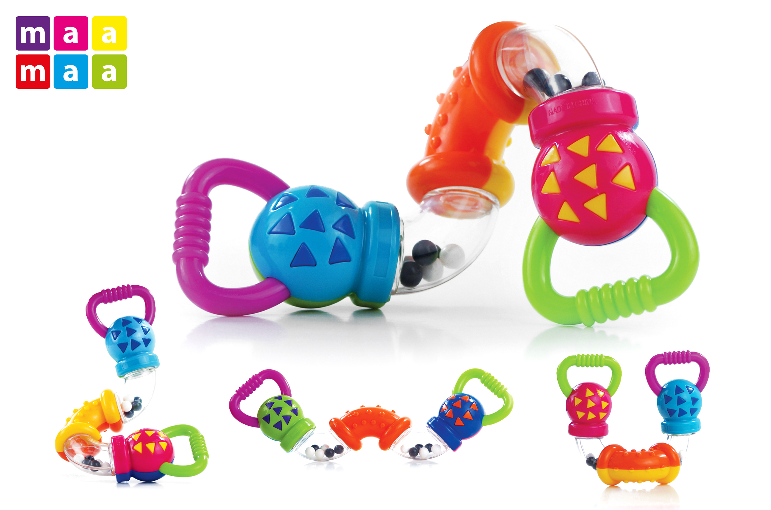 Chrastítko se skládá z různobarevných trubiček, které se dají otáčet. Při otáčení vzniká chrastivý zvuk. Hrkávka hrká také díky kuličkám, kterými je naplněna. Hračka má pohodlné úchyty. Velikost: 17x11cm