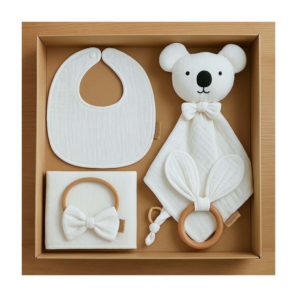 Celotna škatla je usklajena, nežna in elegantna — idealna za dojenčka in popolna kot darilo, polno skrbi in najvišje kakovosti.