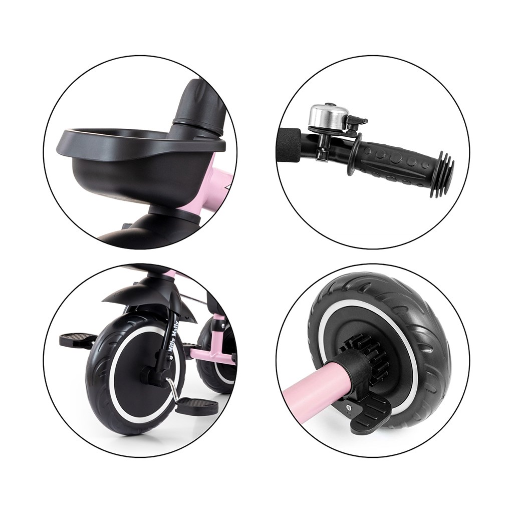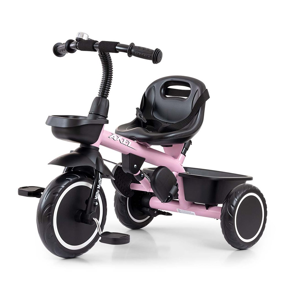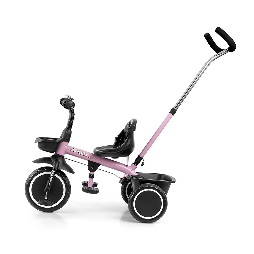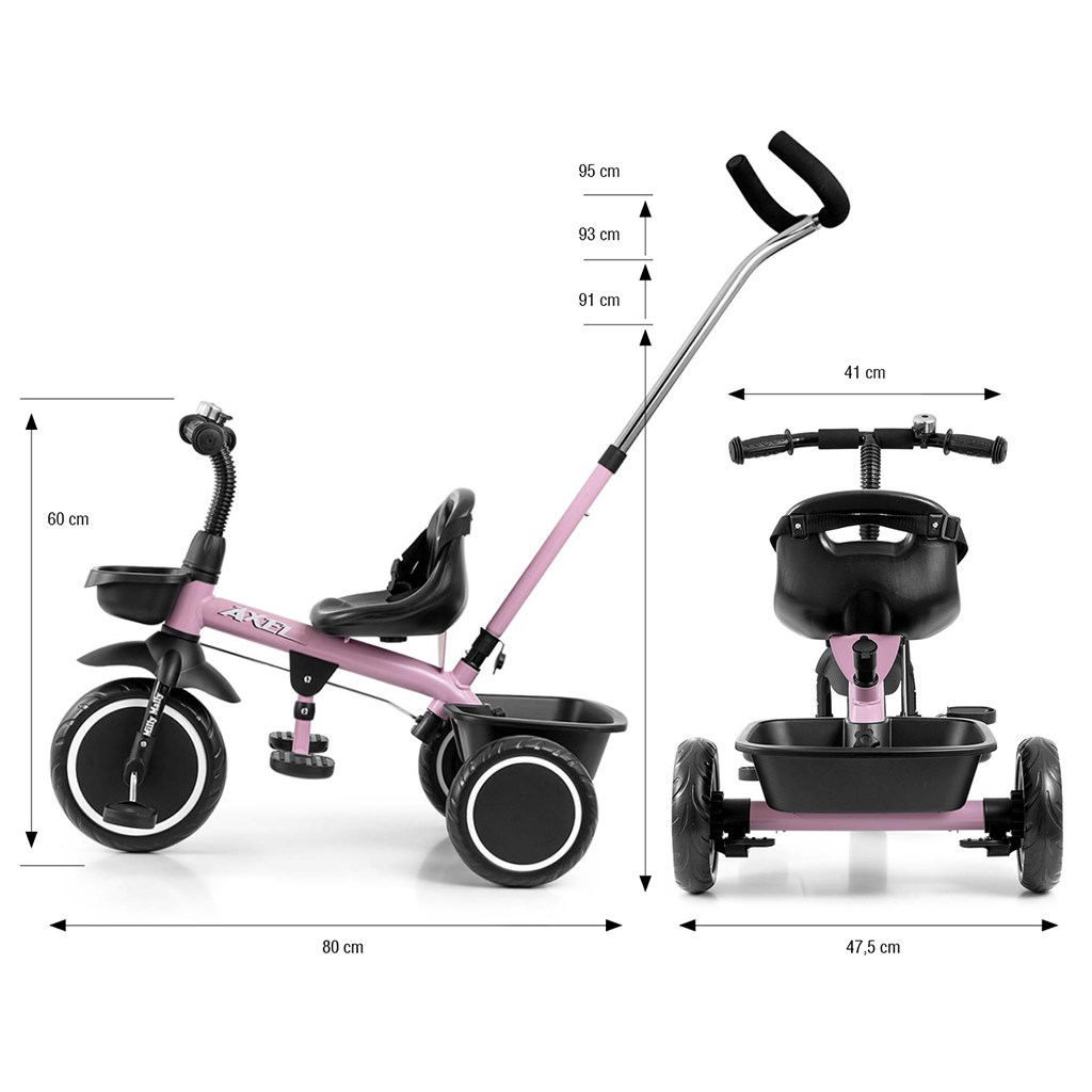 Dětská šlapací tříkolka s rukojetí Axel je určena pro děti ve věku od 1 do 3 let. Je vyrobena z kvalitních a odolných materiálů. Má pohodlné a ergonomicky tvarované sedlo, jehož vzdálenost k řídítkům lze snadno nastavit a tím přizpůsobit tříkolku věku a výšce dítěte. Tříkolka patří k produktům skupiny GROW UP, tedy roste s dítětem. Na předním kole lze uvolnit náhon na pedály a pomocí vodící tyče tlačit malého závodníka, když mu dojdou síly. Široká kola vyrobená z tvrzené pěny EVA, zaručí pohodlí a odolnost na každém povrchu. Do dvou praktických košíků si váš malý závodník naskládá všechny potřebné hračky a může vyrazit vstříc dobrodružství. Kombinace kovové konstrukce a součástek vyrobených z nejkvalitnějších materiálů zaručuje odolnost za všech podmínek. Pro maximální bezpečí dítěte má tříkolka bezpečnostní pásy.