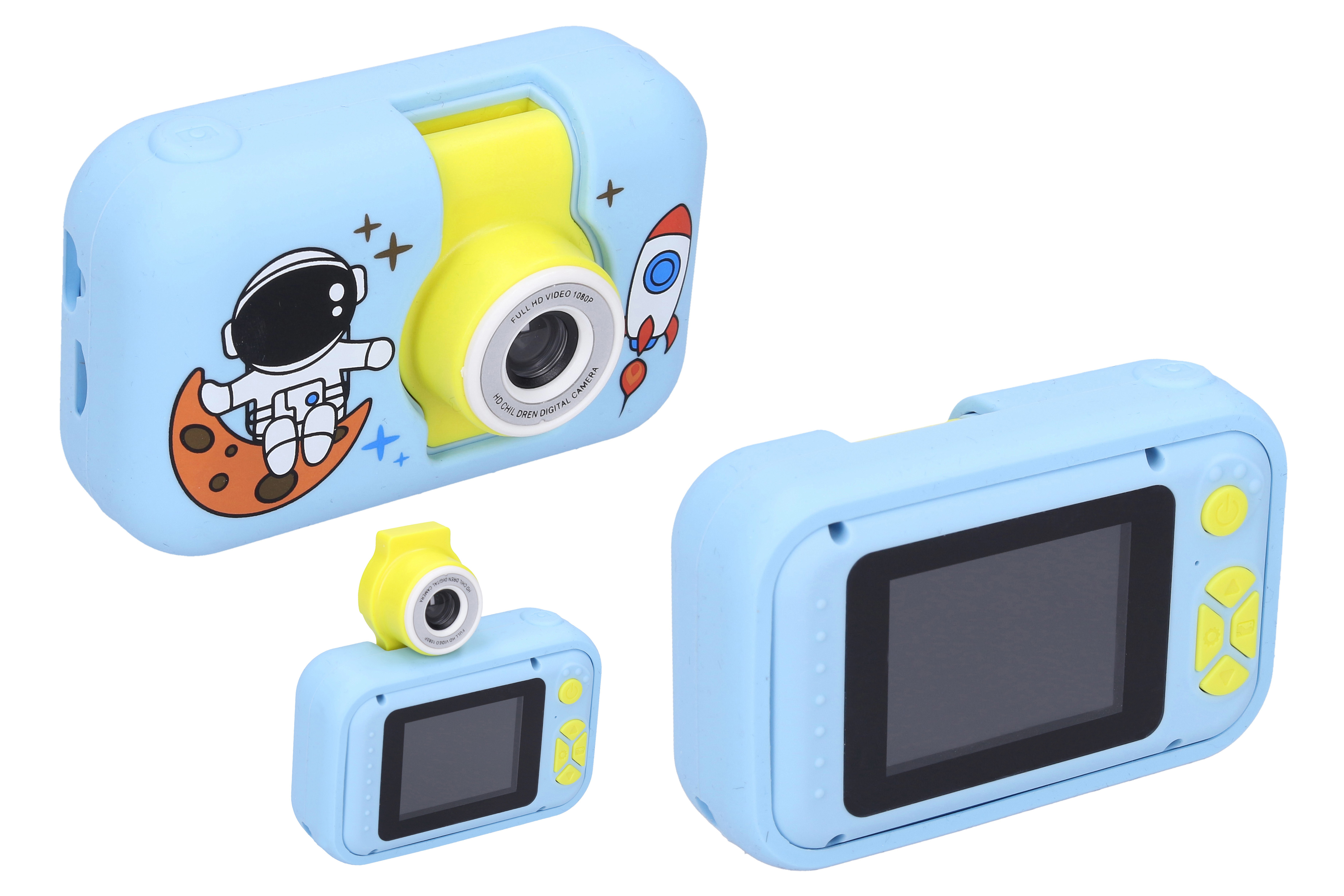 Dětský digitální fotoaparát výklopný objektiv silikonové pouzdro Kosmonaut - foto 40Mpx, video Full HD. Rozměry 9,6x4,2x6,3 cm. Silikonové pouzdro součástí. Rozlišení fotografií 40 megapixelů, videa Full HD (1920x1080). Výklopný objektiv pro selfie foto, časovač 10s/5s/2s, vložení času, 4x digitální zoom, různé efekty (rámečky, vložené animace, deformace, filtry) fotografií, hry, mp3 přehrávač, 2,0 palcový displej. Vestavěná 400mAh Li-ion baterie, USB-C kabel a popruh součástí.