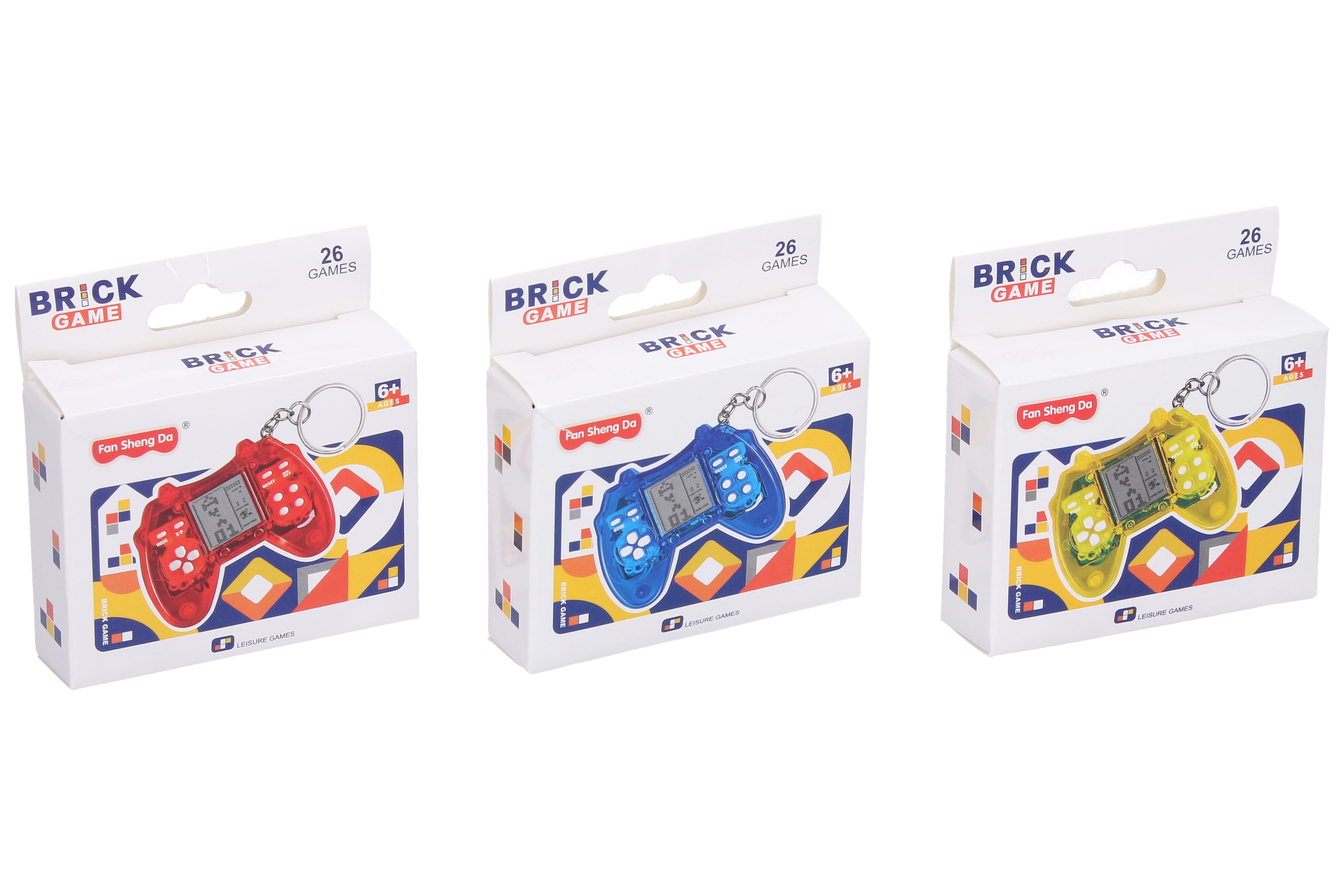 Digitální herní konzole mini 26 her. S přívěskem. Průhledná konstrukce. Rozměry konzole 7x5,5 cm, rozměry displeje 2x2 cm. 2xAG10 baterie součástí. Obrázkový návod s popisem na zadní straně obalu. 18 ks display box. 3 varianty - modrá, žlutá, červená.