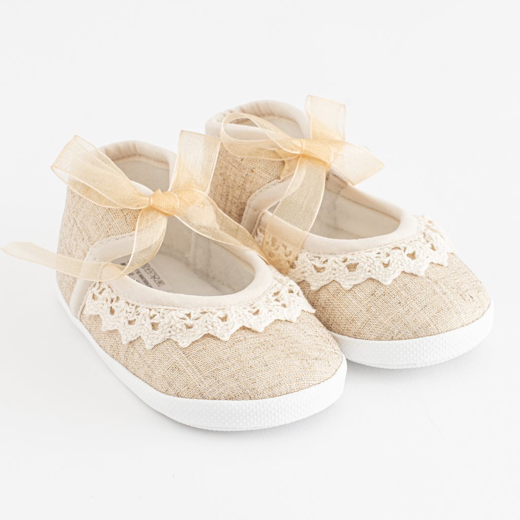 Dojenčke copatki New Baby za dojenčke. Lepi čevlji so v stilu dekliških sandalov z modernim videzom za vezanje. Copatki se prilegajo nogici in imajo širok notranji prostor, kar omogoča prost gib prstov in mišic. Izdelek ni namenjen hoji. So zelo lahki z tankim sintetičnim podplatom. Sestava: čipka: 100% poliester. Podplat: sintetični material PVC brez BPA. Dolžina notranje vložke 10 cm. Namenjeno za otroke 0-3 mesece. Dobavljeno v praktični škatli. Opozorilo: pod tekstilno vložko se včasih nahaja papirnata vložka, ki ohranja obliko copatka. Pred prvo uporabo odstranite to papirnato vložko.
