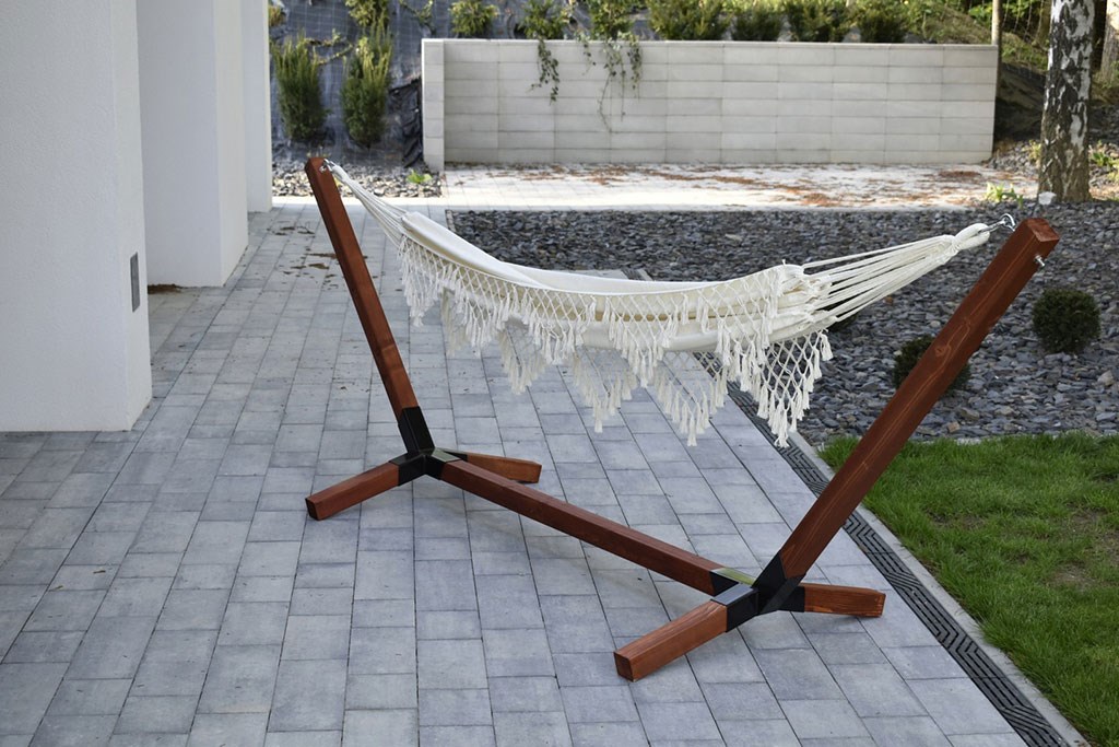 Impregnovaný dřevěno-ocelový stojan na houpací síť Baby Mix – maximální nosnost až 300 kg.