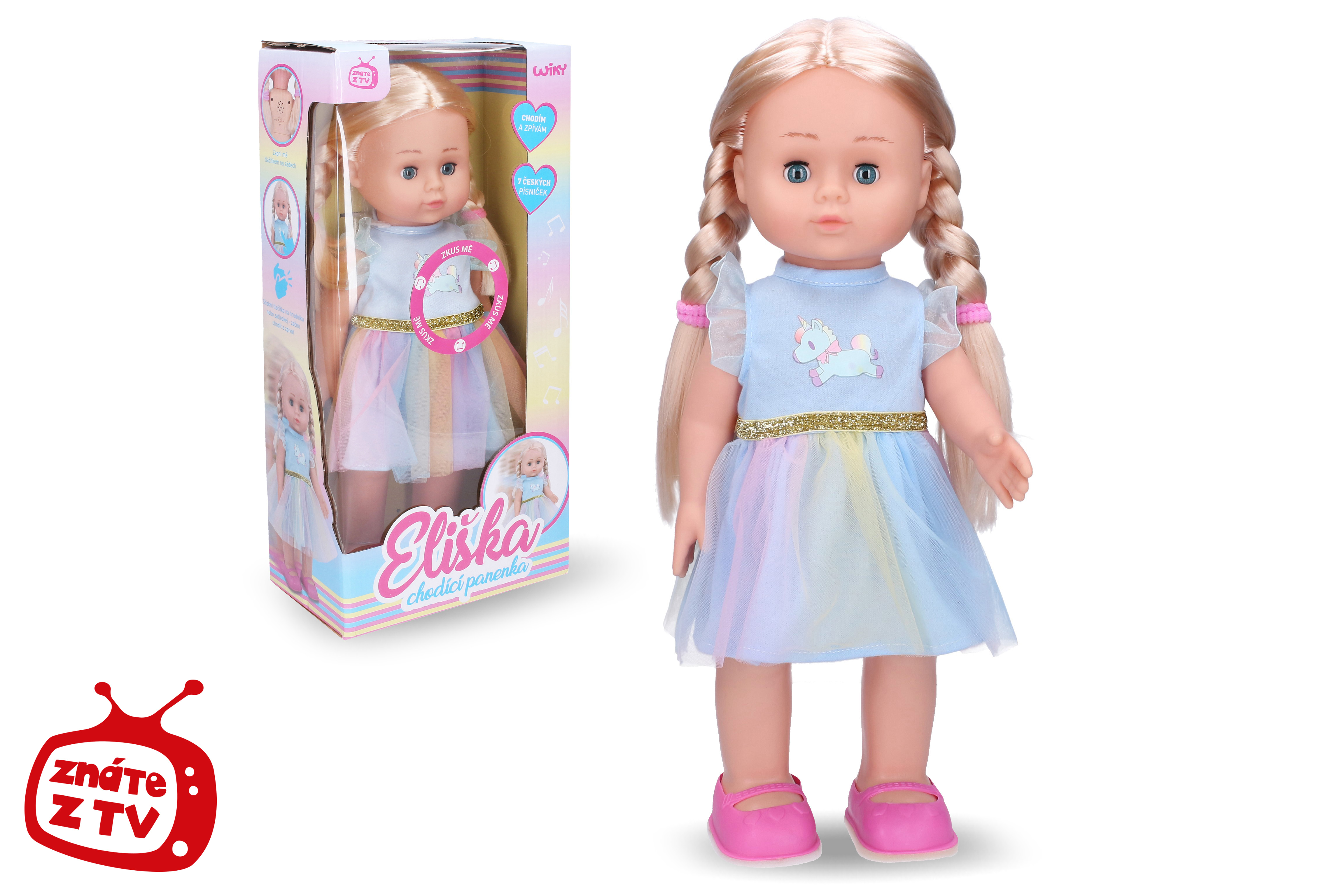 Začni den se svou nejlepší kamarádkou Eliškou. Eliška také ráda chodí a tančí. Vezmeš ji na procházku? Panenku Elišku si zamiluješ! Čeká vás spousta hraní a zábavy! Eliška je chodící panenka, která mooc ráda zpívá! Chceš si s ní zazpívat? Umí 7 lidových písniček. Stačí tlesknout a přidej se! Travička zelená Kočka leze dírou Červený šátečku Prší prší Já do lesa nepojedu Holka modrooká Kalamajka Velikost: 41 cm Doporučený věk: od 3 let Panenku je možno spustit ve dvou režimech (Try me/ON). V režimu Try me jen zpívá, nechodí. Přepínání na zádech. Baterie: 3x AA