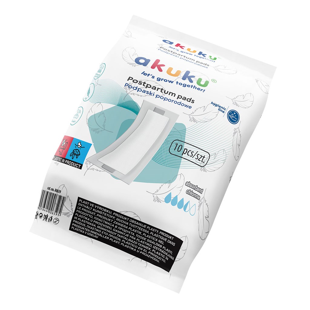 Superabsorpcijske poporodne blazinice „akuku” so namenjene ženam v obdobju šestinedorja, da se počutijo udobno in svobodno v vsaki situaciji. Nežna in super mehka notranja plast preprečuje lepljenje blazinice in draženje kože. Zgornja plast omogoča kroženje zraka, s čimer zagotavlja občutek svežine, in superabsorpcijski material znotraj blazinice hitro veže vlago ter nevtralizira neprijetne vonjave. Široka lepilna plast drži blazinico na mestu.