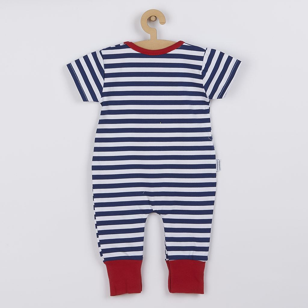Čudovit in stiliziran poletni bombažni kombinezon češke blagovne znamke New Baby Marine za dojenčke. Kombinezon je celotno potiskan z modernimi črtami in ima čudovit našitek čolna. Našitek je podložen s tkanino, da prepreči praskanje. Zapiranje na ramenih in med nogicami olajša oblačenje in previjanje dojenčka. Za dojenčke je kombinezon pomemben kos oblačila, saj so pri vsakem gibanju hrbtka dojenčka vedno pokrita. Za New Baby je zelo pomembna zadovoljstvo kupcev in zato vam ponujamo našo kakovostno poletno kolekcijo Marine. Sestava: 100% bombaž.