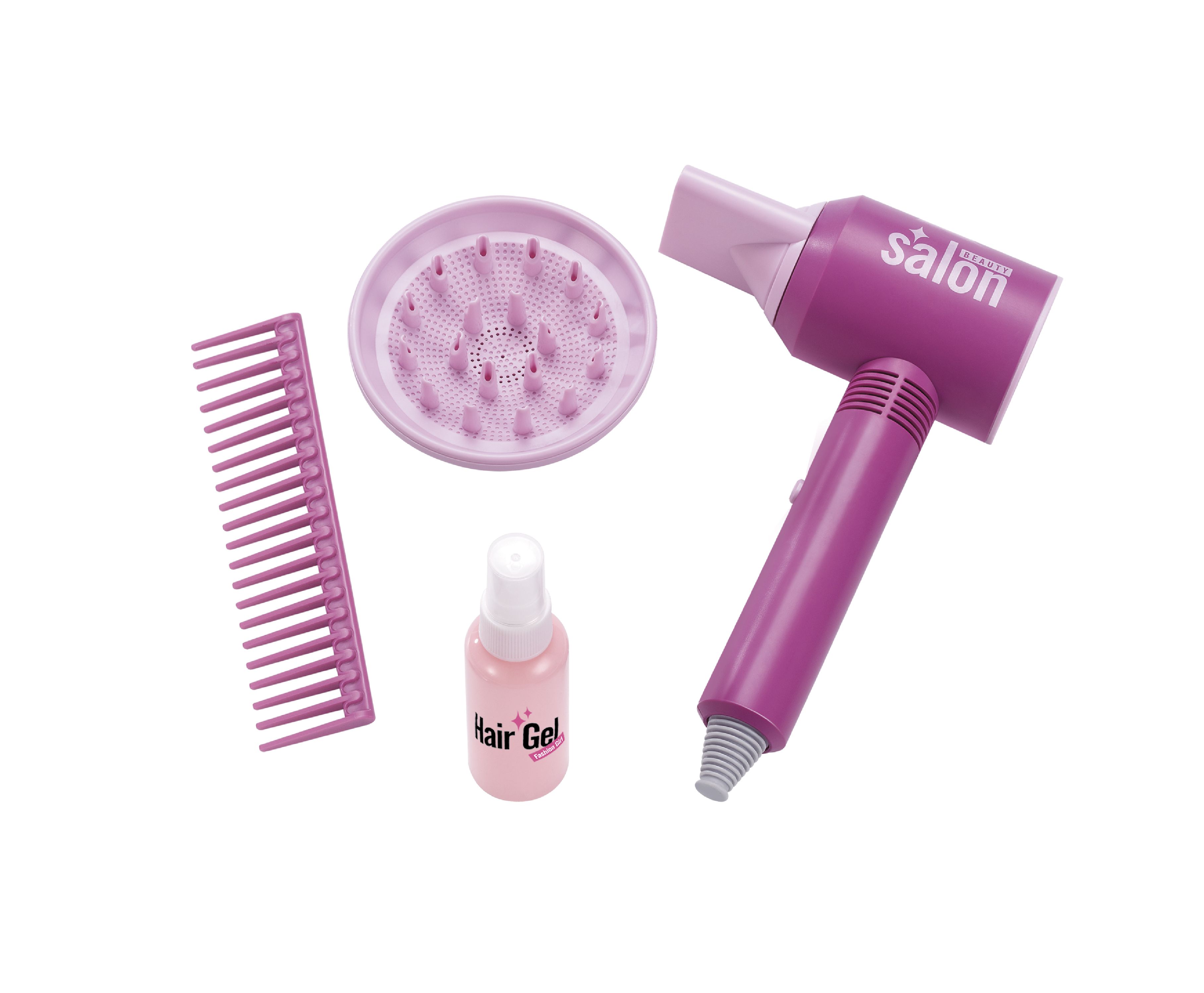 Fén s příslušenstvím. Velikost fénu 19cm. Obsahuji fén s nástavci, hřeben lahvičku na přípravek na vlasy. Skutečně fouká vzduch. Přepínač má tři polohy: 2rychlosti a vypnutí. 3xAAA baterie nejsou součástí.