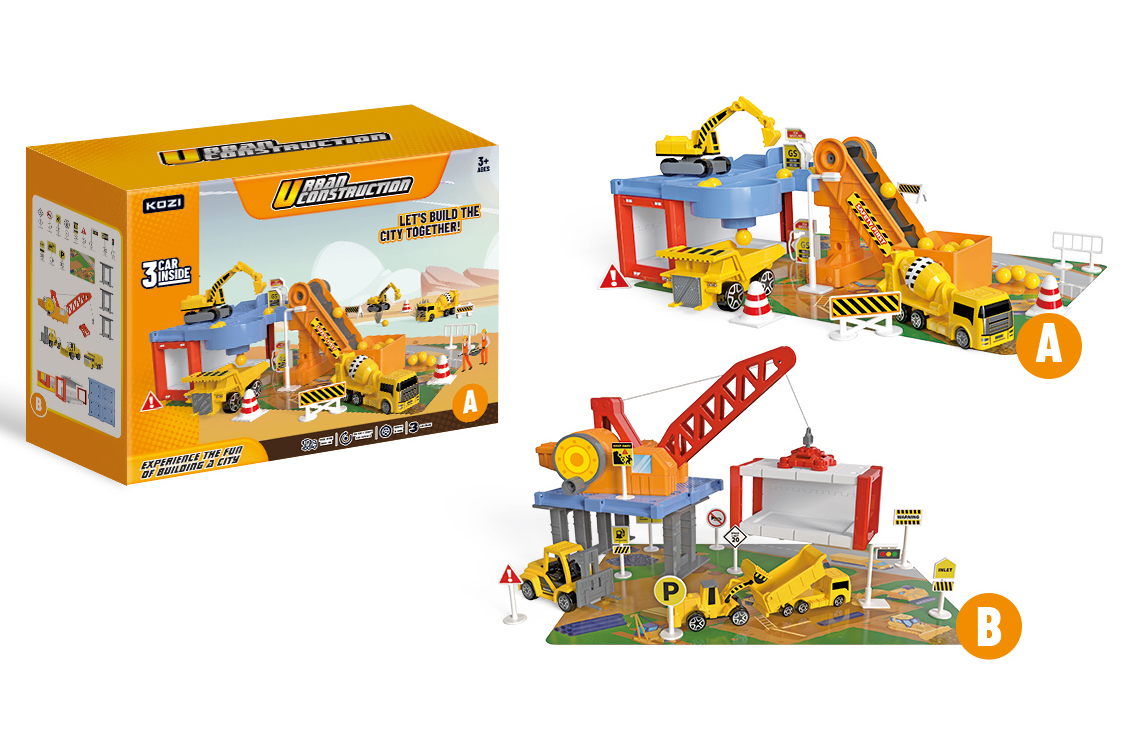 Obsahuje garáž, sklápěč, bagr, domíchávač, přepravní pás, značky.