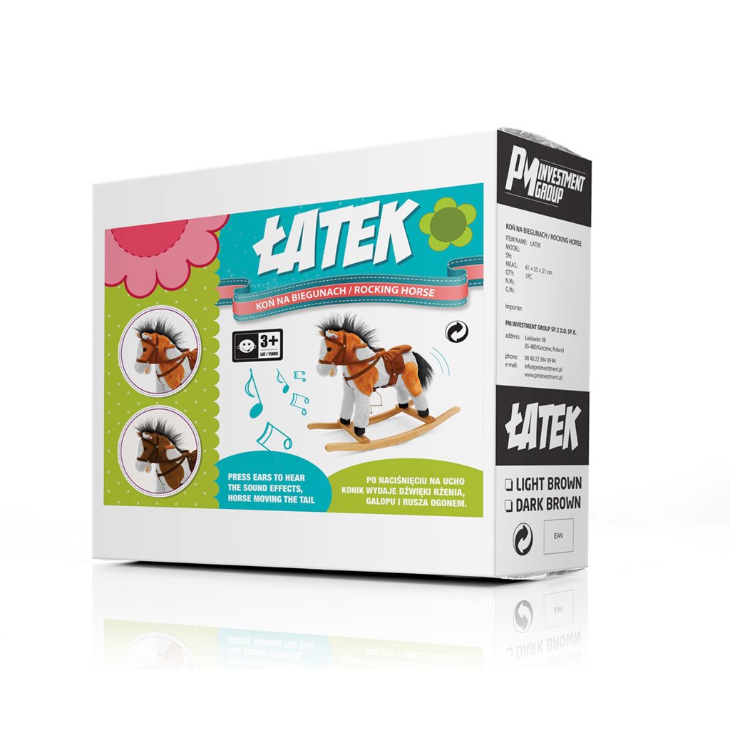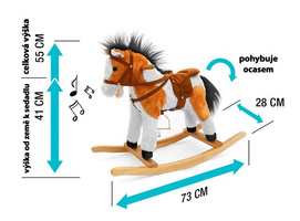 Izjemno lep črni konjček Milly Mally z mnogimi zanimivimi funkcijami. Ob pritisku na ušes konjček premika rep in gobec ter izdaja zvoke. Izdelan je iz mehkega plišastega materiala, kar omogoča, da se vaše otroka dolgo zabava. Igrača ima sedlo, opore in lesene ročaje. Konjička lahko odstranimo iz gugalnega okvirja in ga uporabimo kot samostojno plišasto igračo. Pakiran je ločeno v škatli, ki jo je mogoče uporabiti tudi kot darilno pakiranje. Trenutno so konjički brez rdeče pentlje. Baterije niso vključene v pakiranje.