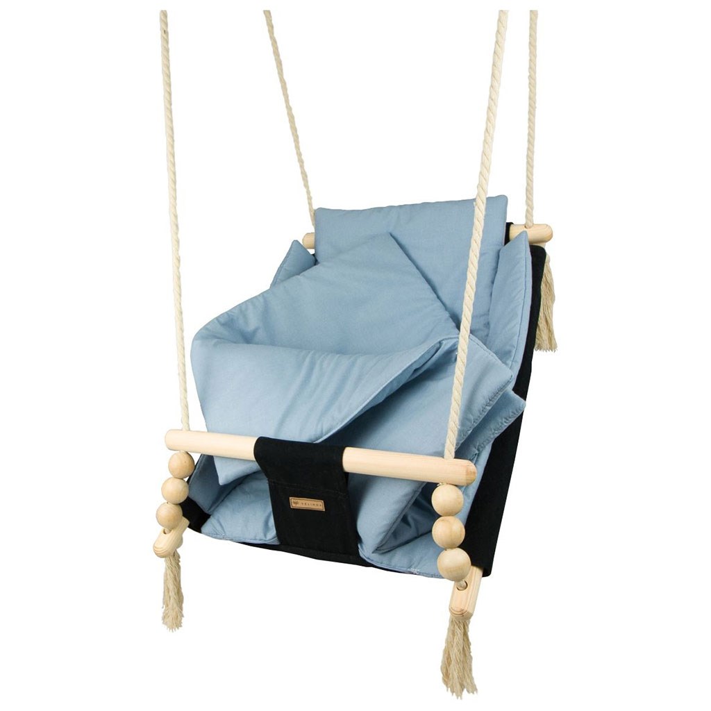 Zaradi uporabe prijetnega bombaža se tu otrok počuti prijetno, udobno in varno. Močna bombažna vrvica je opremljena s kovinskimi kolesi, ki omogočajo namestitev gugalnice tudi na teraso, verandu ali v vrt.
