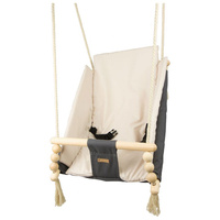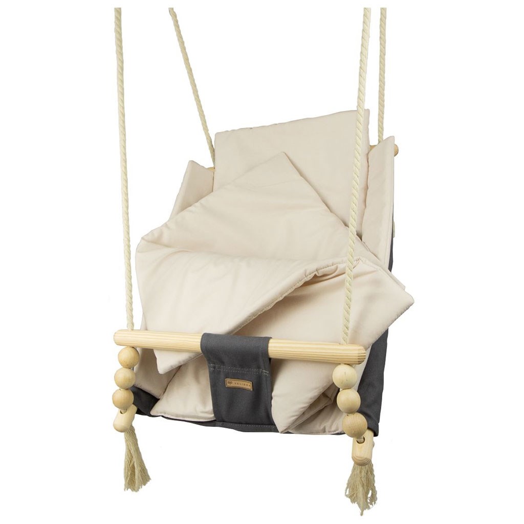 Zaradi uporabe prijetnega bombaža se tu otrok počuti prijetno, udobno in varno. Močna bombažna vrvica je opremljena s kovinskimi kolesi, ki omogočajo namestitev gugalnice tudi na teraso, verandu ali v vrt.