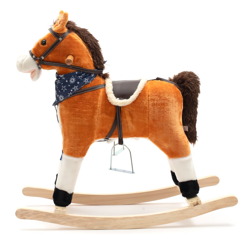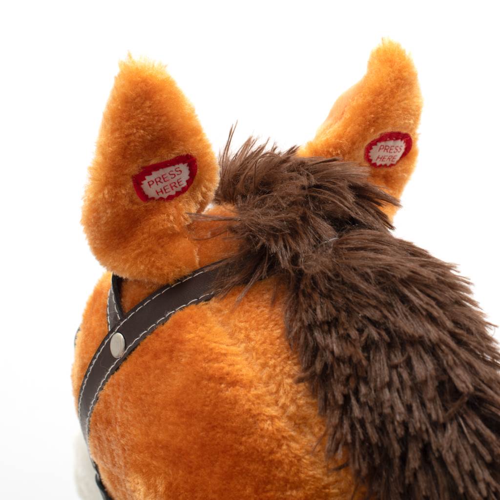 Izjemno lep viseči konjiček z rdečo maramo okoli vratu. Ob stisnjenju ušes konjiček zamahne s repom, odpre usta, izdaja zvoke galopirajočega konja ali poje pesmico. Udobno sedlo, trdna uzda, lesene ročice ali kovinske stremene zagotavljajo vašim mališim cowboyem še več stabilnosti in udobja med nihanjem. Izdelan je iz mehkega plišastega materiala, trdni leseni nikelj ali ročice pa se lahko enostavno odstranijo. Baterije se vstavijo v ohišje, ki se nahaja na trebuščku konjička.