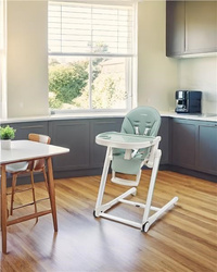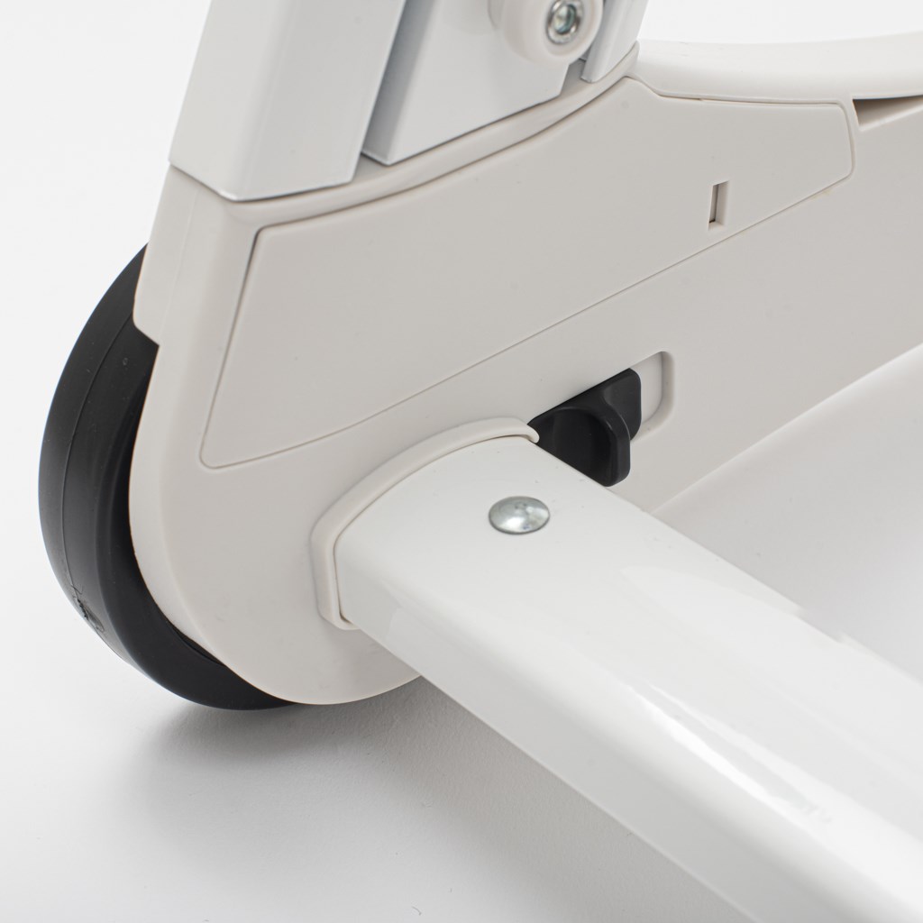 -Jedilna stolica je opremljena z dvema kolesoma z zavoro in dvema gumijastima nožicama.
