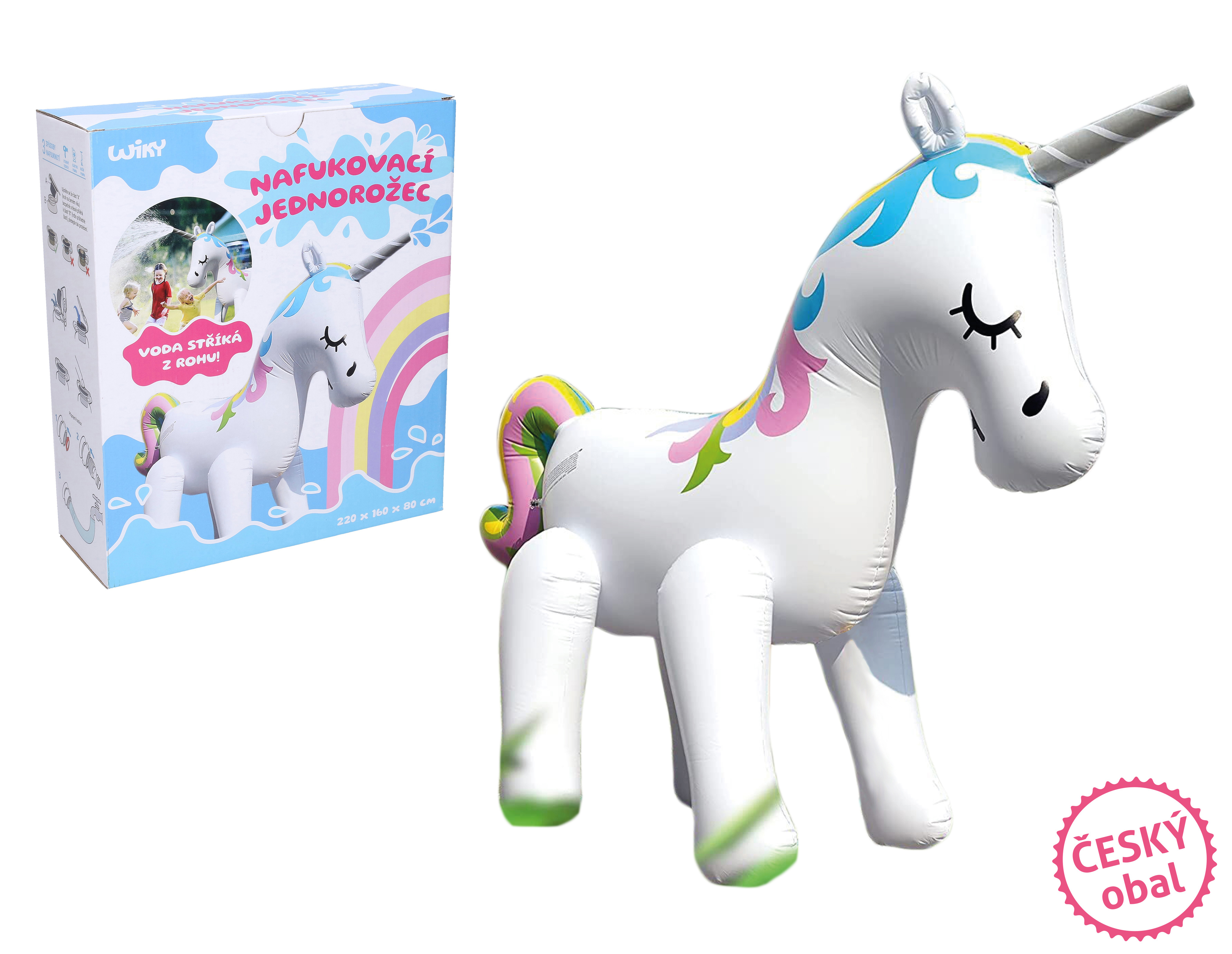 Jednorožec stříkající. Rozměry nafouknutého jednorožce 220x160x80 cm.