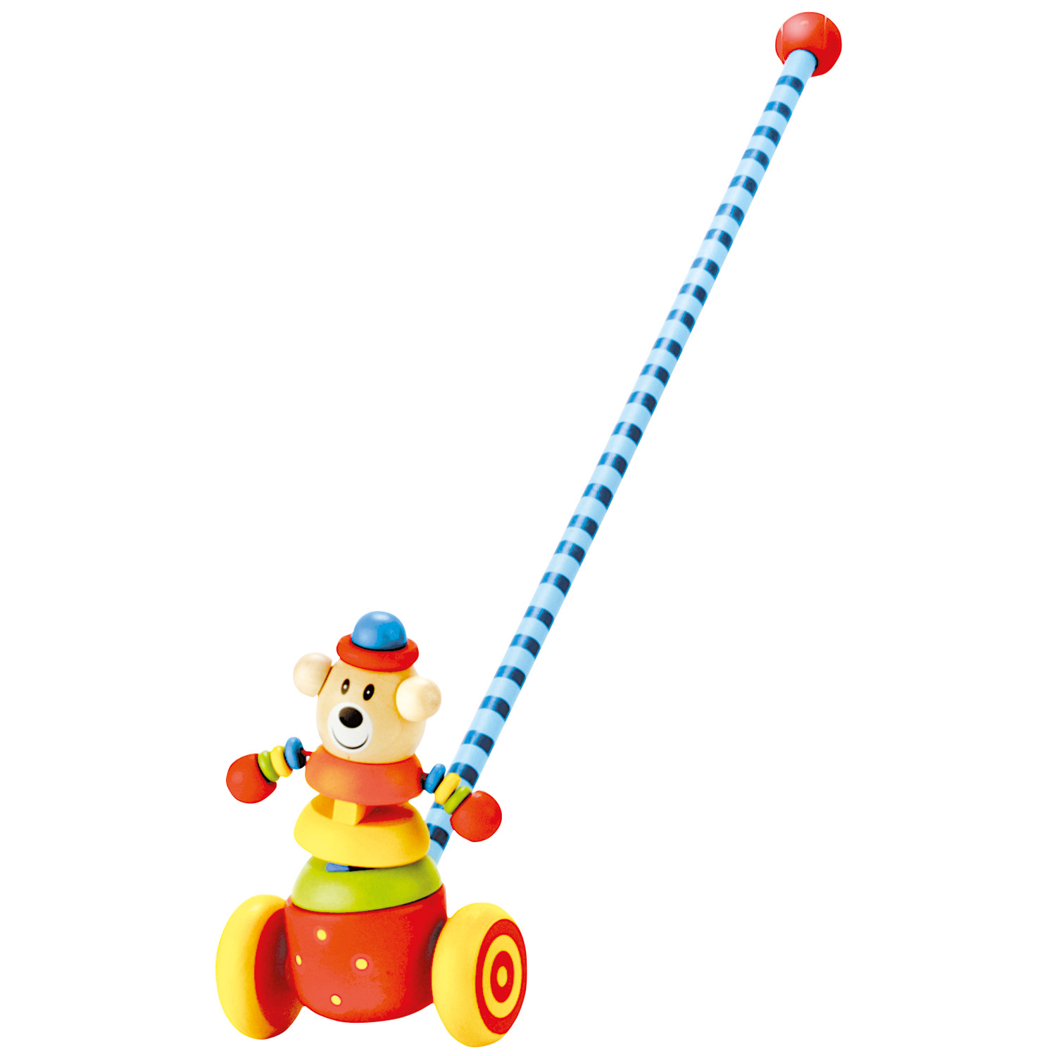 Dřevěný medvídek se při jízdě naklání z boku na bok. Rozměry: 7x7x55 cm.