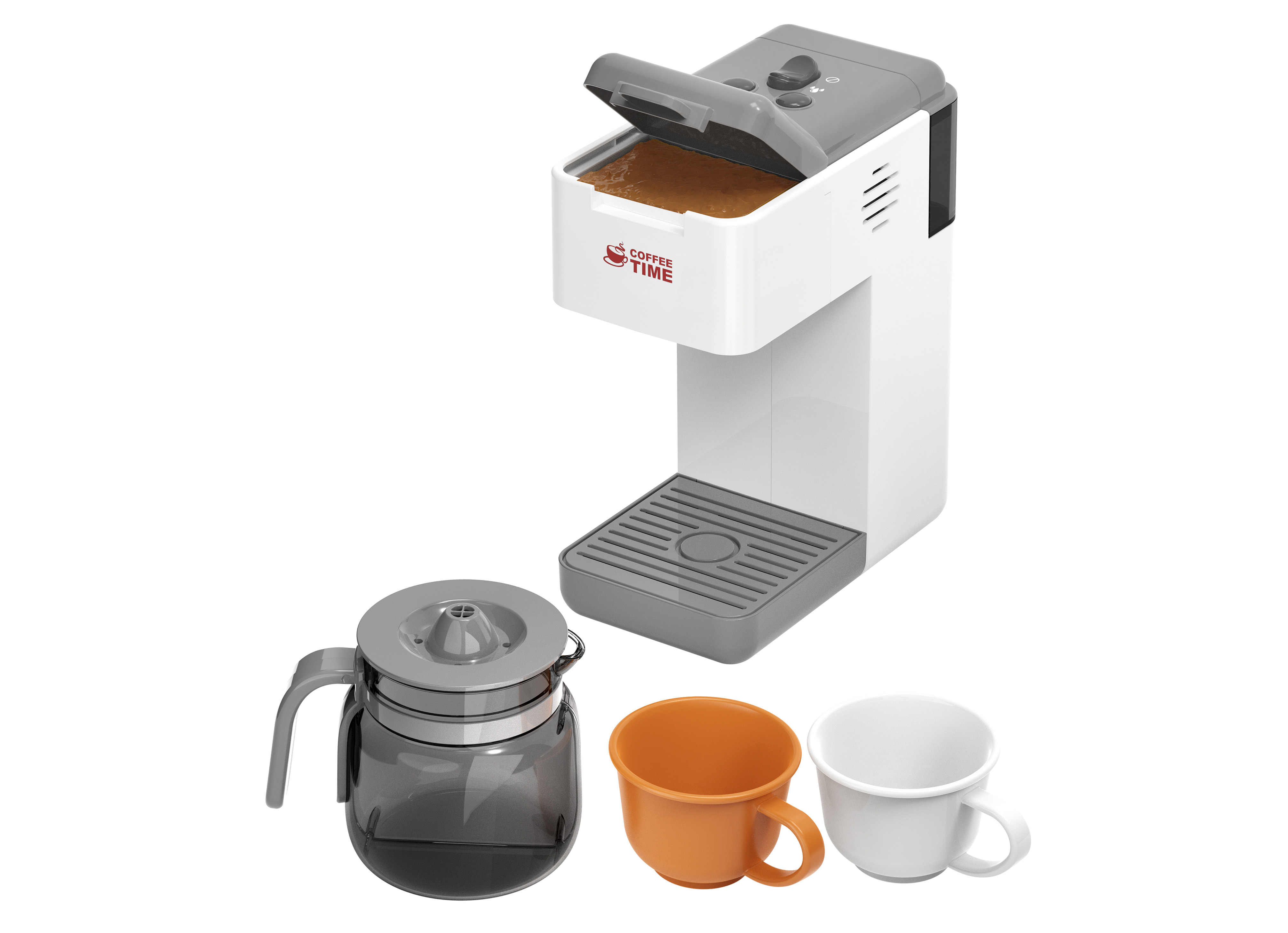 Kávovar s konvicí a tekoucí vodou. Rozměry 20x9x20cm. 2xAA baterie nejsou součástí. světelné a zvukové efekty. obsahuje kávovar, konvici a dva hrnečky. Po naplnění kávovaru vodou do nádržky nahoře vzadu kávovar napouští vodu do konvice. tlačítko on/off. obrázkový návod na obalu.