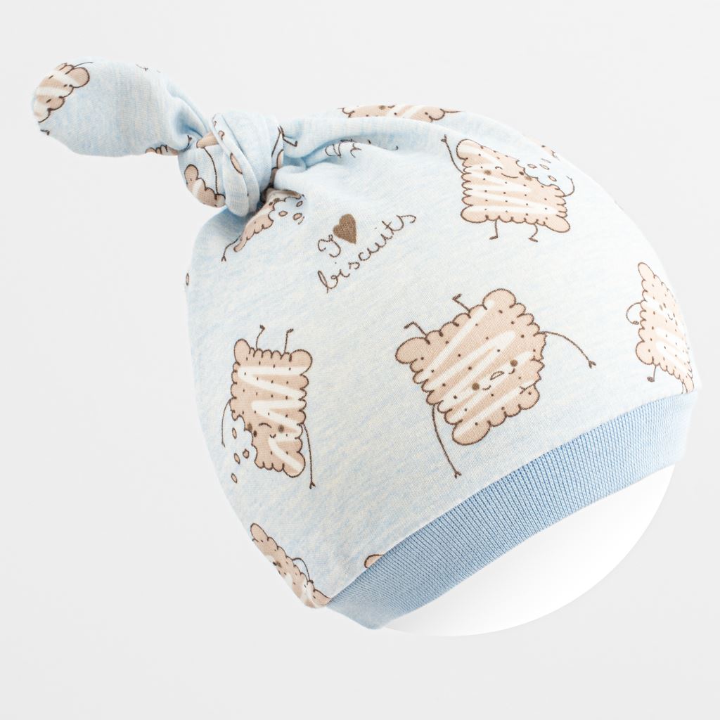 Kojenecká čepička české značky New Baby Biscuits s roztomilým uzlíkem v horní části. Čepička je celopotištěná obrázky sušenek. Skvělá vychytávka, kterou lze využít jako krásný doplněk, nebo jako praktický kousek oblečení. Lem je široký a netlačí na hlavičku miminka. Příjemná na dotek a krásně sedí na hlavičce. Fantazie v oblékání nezná hranic a záleží jen na vás, jak čepičku doladíte s oblečením kolekce Biscuits. Složení: 100% bavlna.