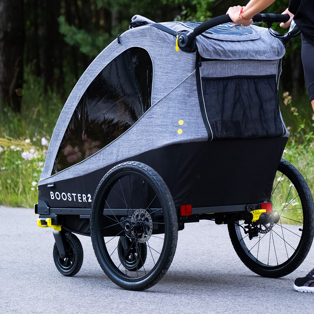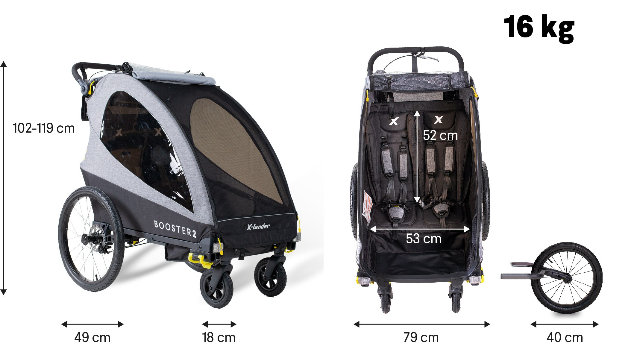 X-lander Booster 2 je večfunkcijski izdelek, ustvarjen za aktivne starše, ki želijo kar najbolj učinkovito preživljati čas s svojimi otroki na prostem. Omogoča uporabo enega vozička na več načinov – za sprehode po neravnem gozdnem terenu, jogging ali priklop vozička na kolo za dolge kolesarske poti.