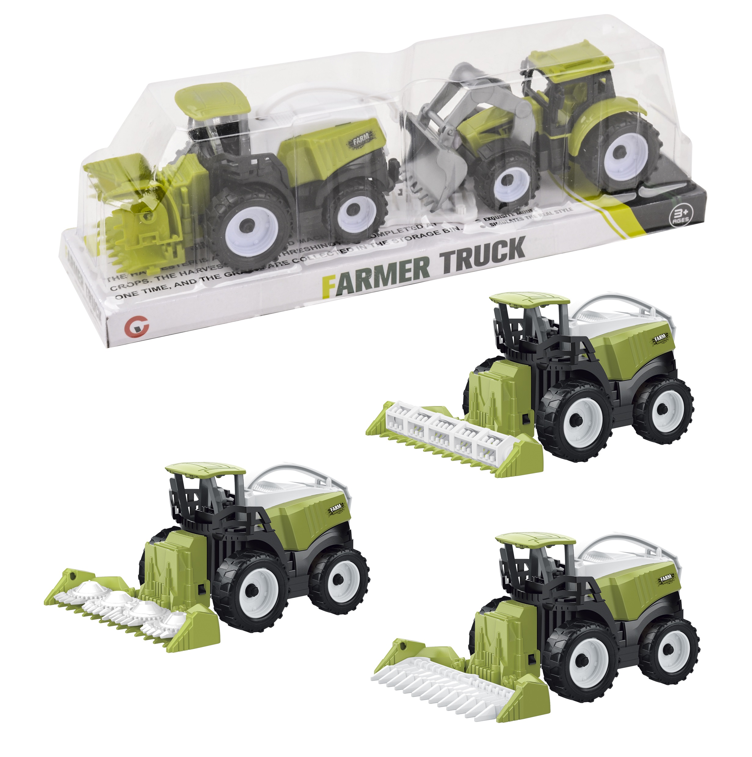 Kombajn s traktorem. Rozměry 12,5x5,5x6,5 cm. Na zpětné natažení. 3 varianty.