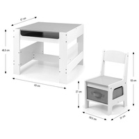 Večfunkcionalna otroška pohištvena garnitura. Miza SVEN z 2 stoličkama v beli in sivi barvi ter s sivimi dodatki je zasnovana tako, da otrokom nudi: udobje, prostor za ustvarjalno igro, risanje, pisanje in največje udobje pri aktivnostih. Garnitura vključuje 2 stoli z 2 tekstilnimi shranjevalnimi pripomočki, ki sta shranjena v polici pod stoli. Miza je opremljena s velikim prostorom za shranjevanje, ki se nahaja pod obojestransko odstranljivo ploščo. Ima tudi stranske shranjevalne police. Na eni strani mize je velika risalna tabla. Stoli so lahki in otroci jih lahko prosto premikajo. Pohištvo je izdelano z izjemno natančnostjo in skrbnostjo. Vsi stoli imajo zaobljene robove, kar otroka ščiti pred poškodbami. Vsi elementi konstrukcije mize in stoli zagotavljajo visoko stabilnost in zmanjšujejo tveganje padca. Garnitura Sven, narejena iz MDF, je odporna in enostavna za vzdrževanje. Pohištvena garnitura se enostavno sestavi in vse komponente, potrebne za montažo, so vključene v pakiranje.