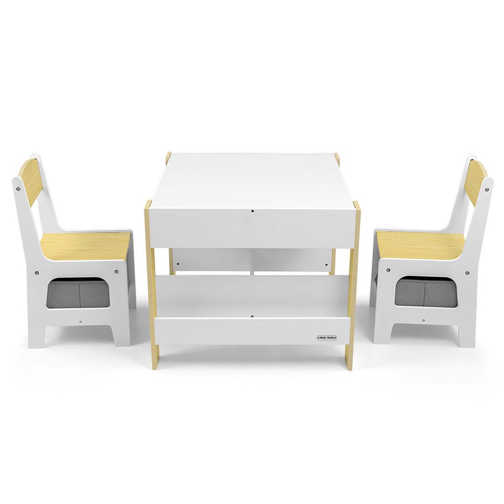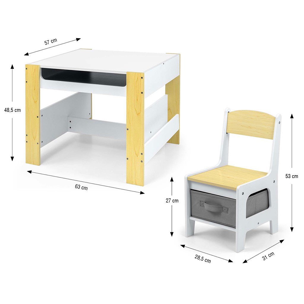 Večfunkcionalna otroška pohištvena garnitura. Miza SVEN z 2 stoličkama v beli in sivi barvi ter s sivimi dodatki je zasnovana tako, da otrokom nudi: udobje, prostor za ustvarjalno igro, risanje, pisanje in največje udobje pri aktivnostih. Garnitura vključuje 2 stoli z 2 tekstilnimi shranjevalnimi pripomočki, ki sta shranjena v polici pod stoli. Miza je opremljena s velikim prostorom za shranjevanje, ki se nahaja pod obojestransko odstranljivo ploščo. Ima tudi stranske shranjevalne police. Na eni strani mize je velika risalna tabla. Stoli so lahki in otroci jih lahko prosto premikajo. Pohištvo je izdelano z izjemno natančnostjo in skrbnostjo. Vsi stoli imajo zaobljene robove, kar otroka ščiti pred poškodbami. Vsi elementi konstrukcije mize in stoli zagotavljajo visoko stabilnost in zmanjšujejo tveganje padca. Garnitura Sven, narejena iz MDF, je odporna in enostavna za vzdrževanje. Pohištvena garnitura se enostavno sestavi in vse komponente, potrebne za montažo, so vključene v pakiranje.