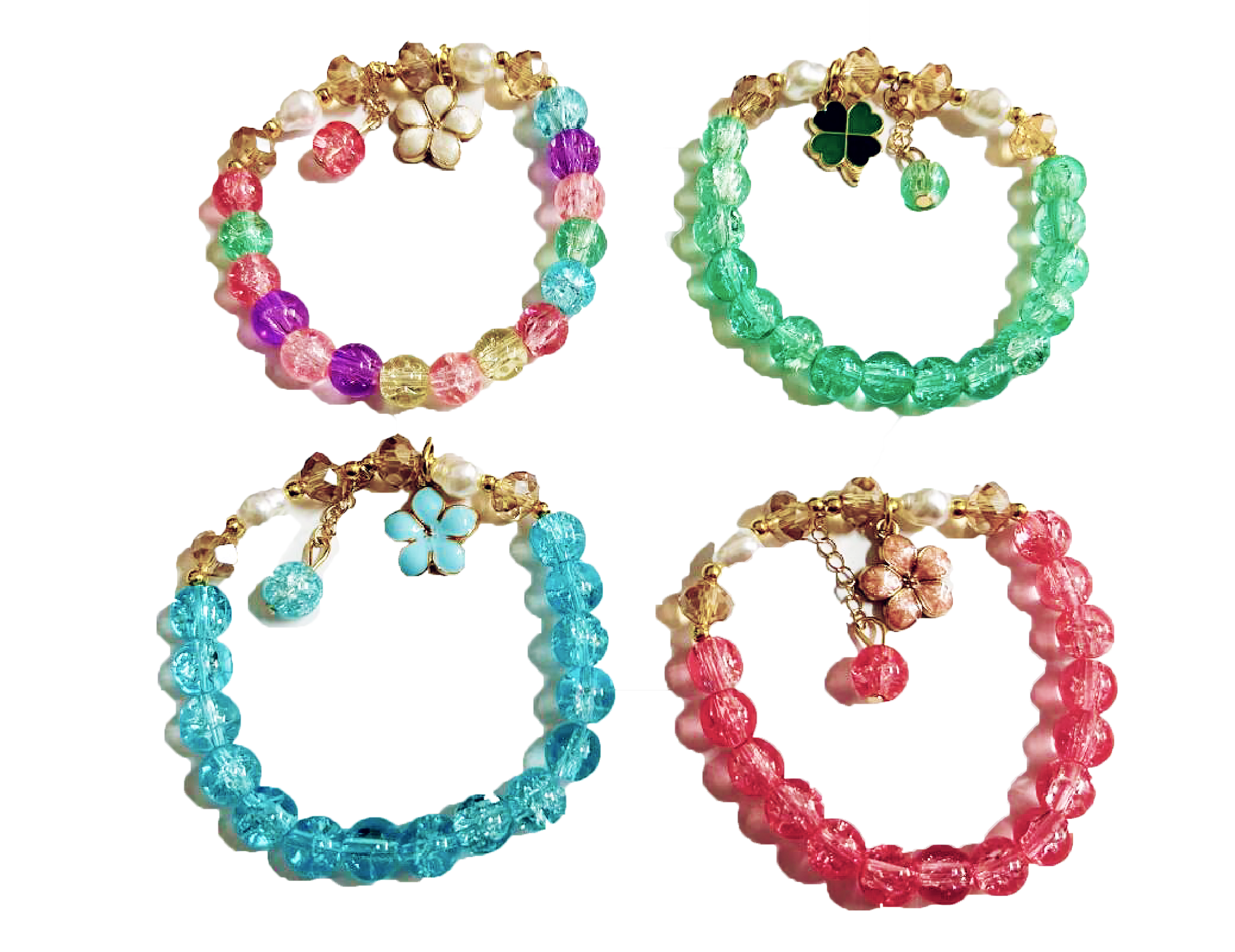 Korálkový náramek s květinou. Rozměry krabičky 19,5x19,5x5 cm. Display box 12 ks. 4 varianty - modrá, bílá, růžová, zelená.
