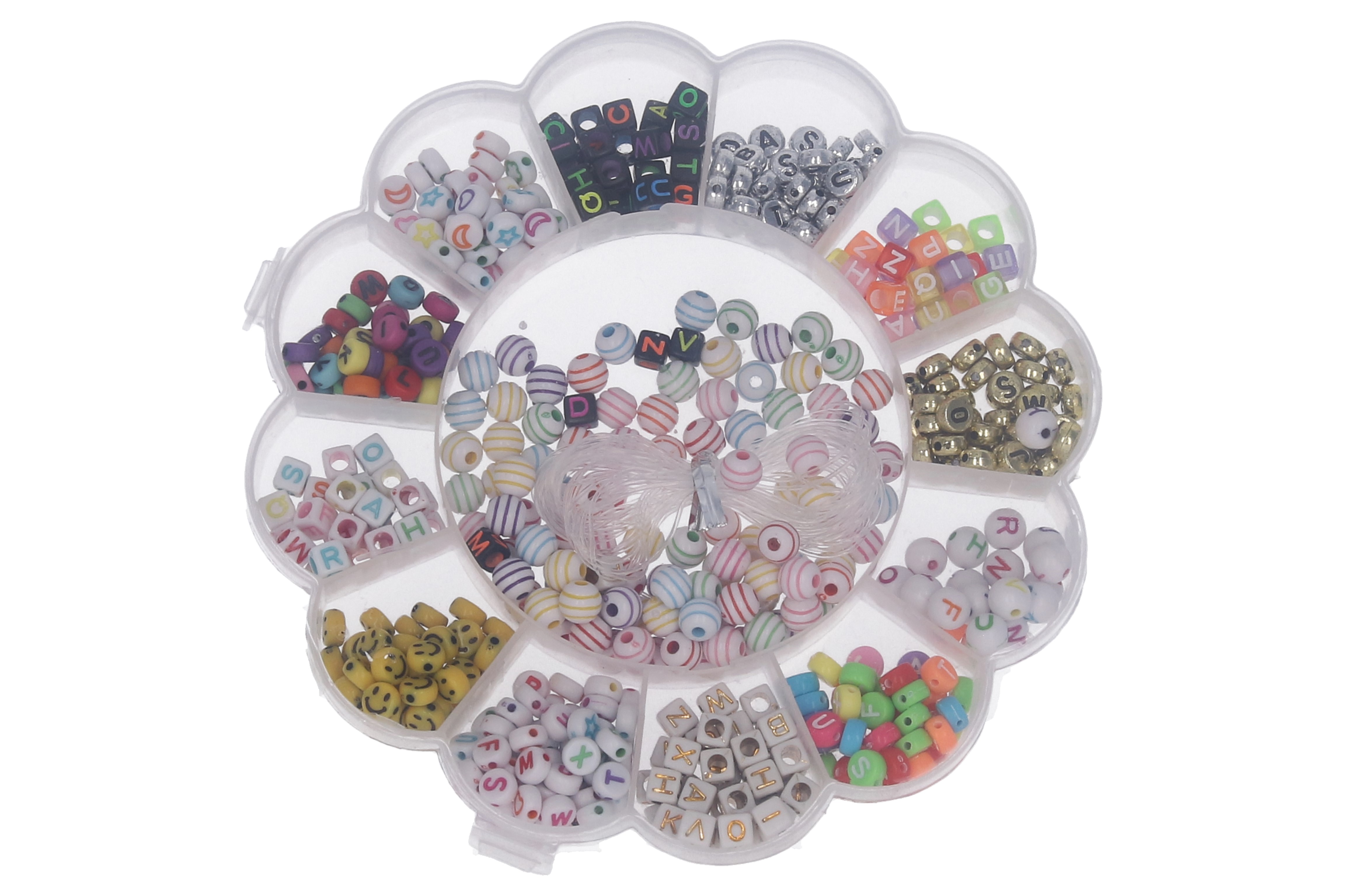 Korálkový set o hmotnosti 90g ve tvaru kopretiny. 13 různých druhů korálků + provázek.